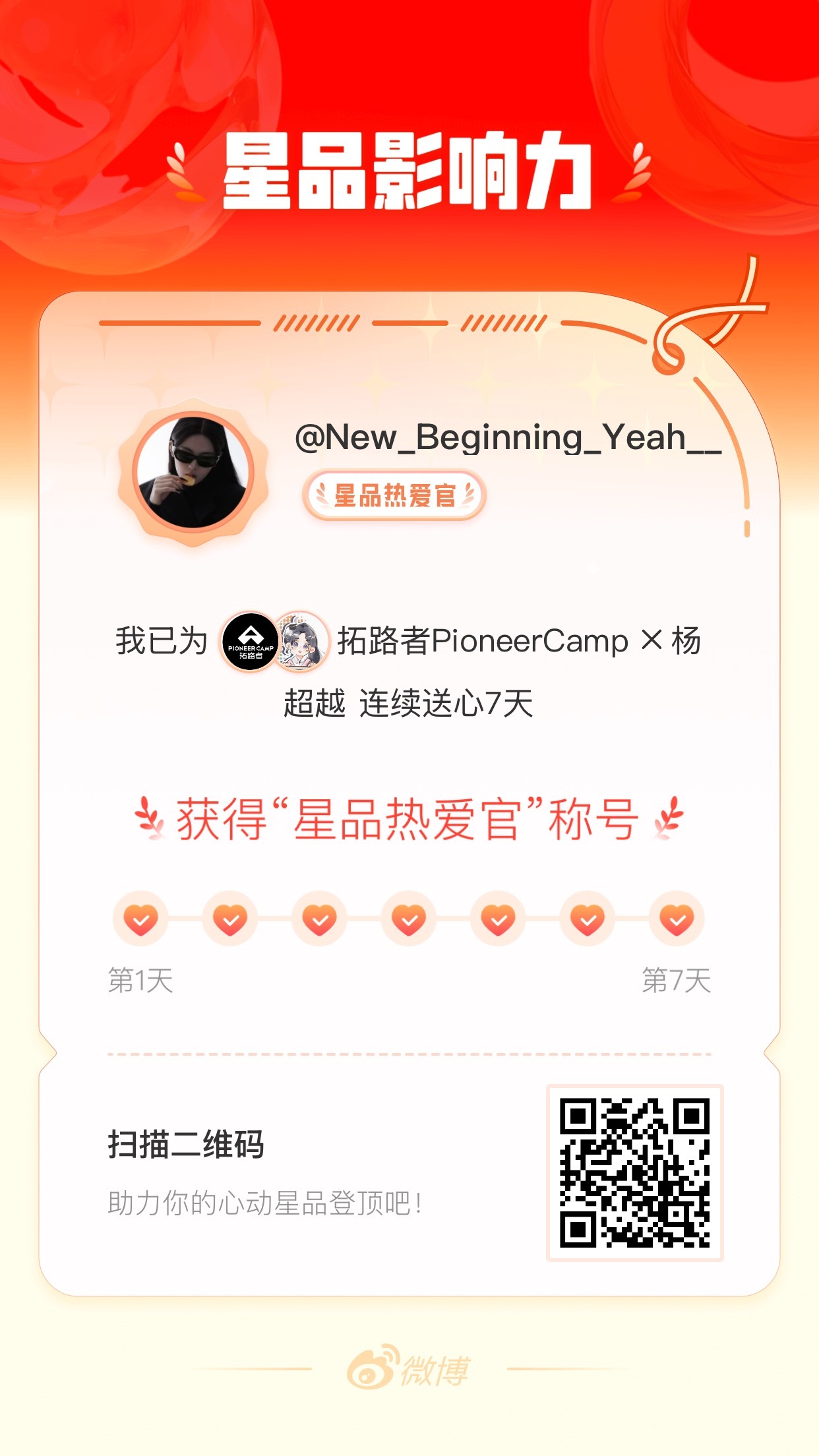 我在星品影响力上为X连续送心7天,获得“星品热爱官”称号!杨超越快来一起p