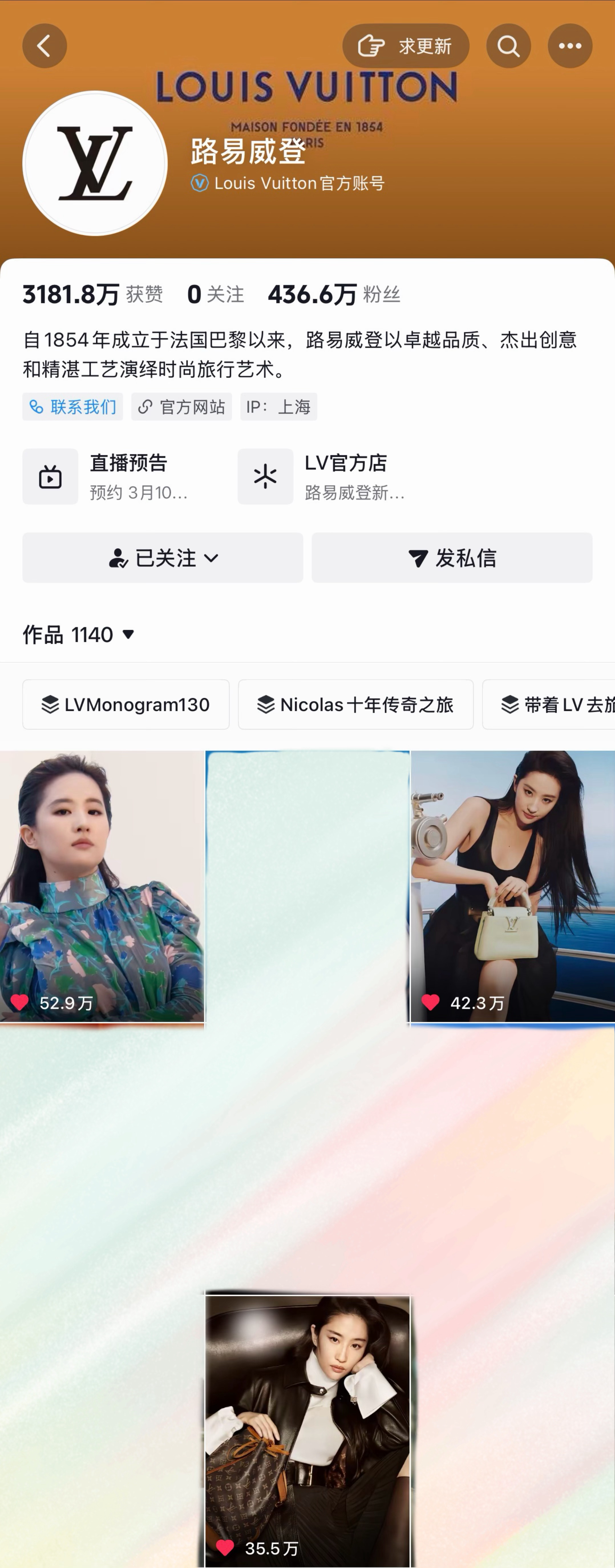看了下LV官抖历史热度,刘亦菲前三占二,前九占三,历史热度冠军也是天仙的,期待这个刚出镜LV百年企划的权威的路易威登品牌代言人刘亦菲