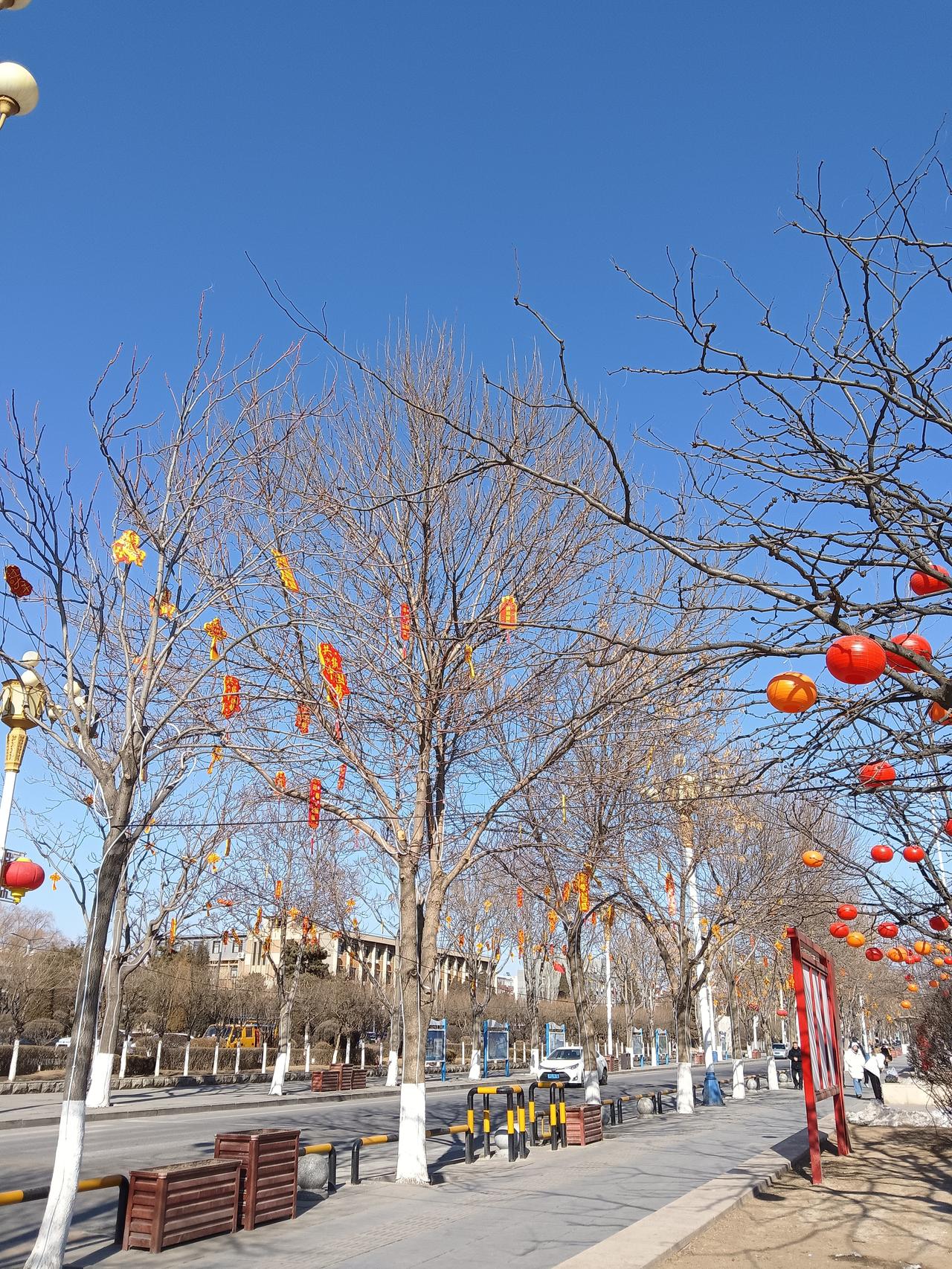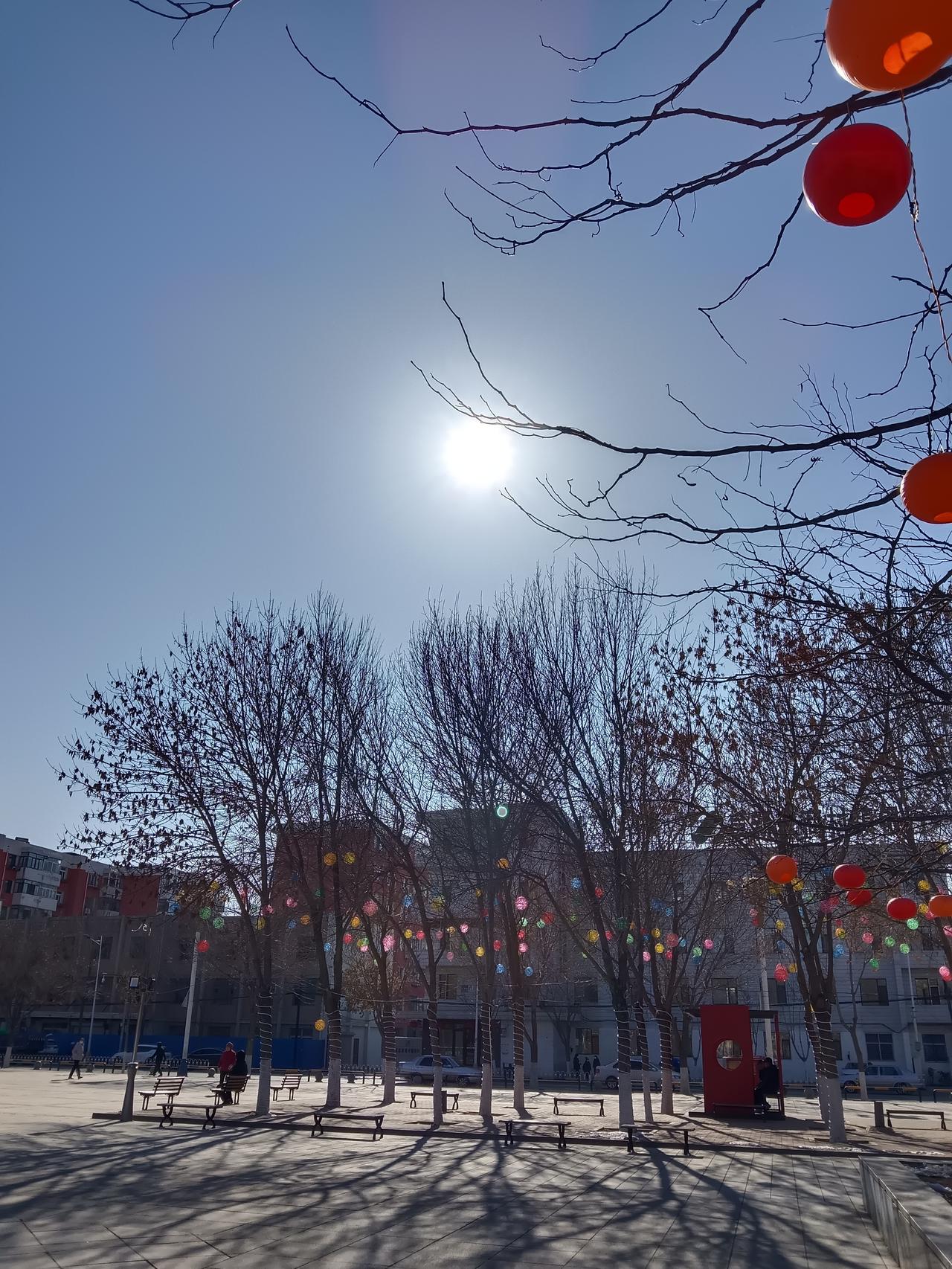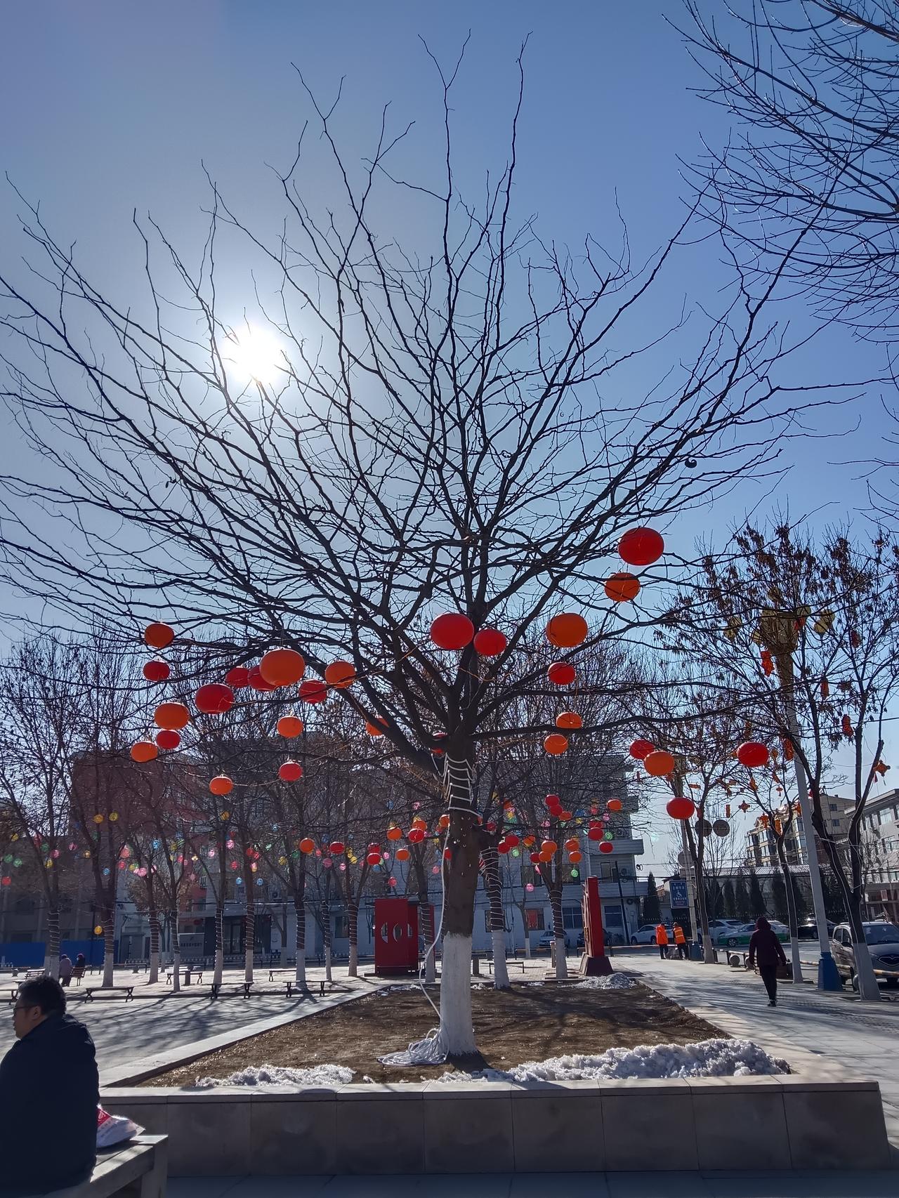 冬日暖阳下,红灯笼挂满枝头,节日气氛浓厚。