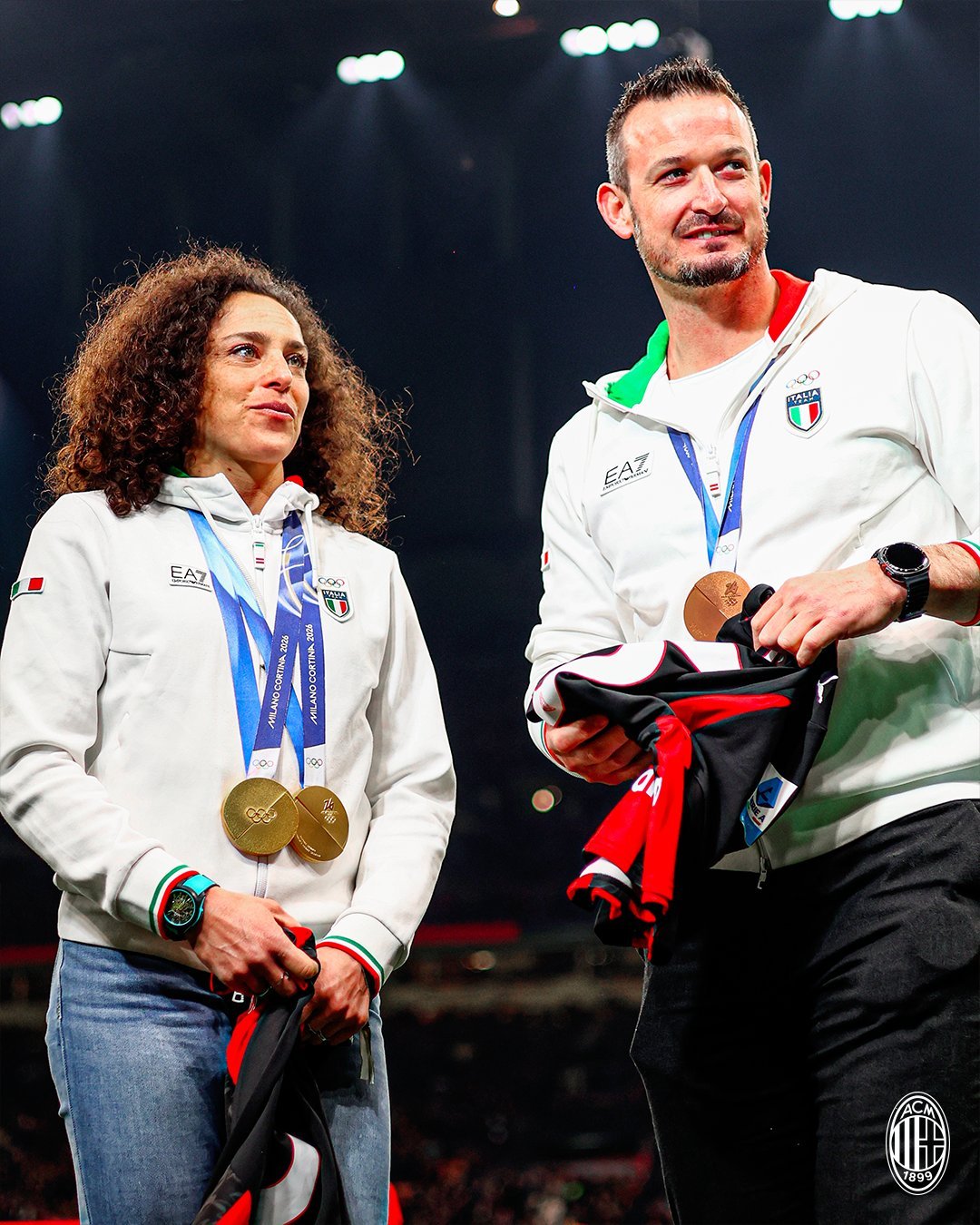 【🥇】 🔴⚫️ 赛前米兰冬奥会金牌获得者、米兰球迷Federica·Brignone🇮🇹和Dominik·Paris🇮🇹亮相圣西罗球场。👏🏻sempremilan