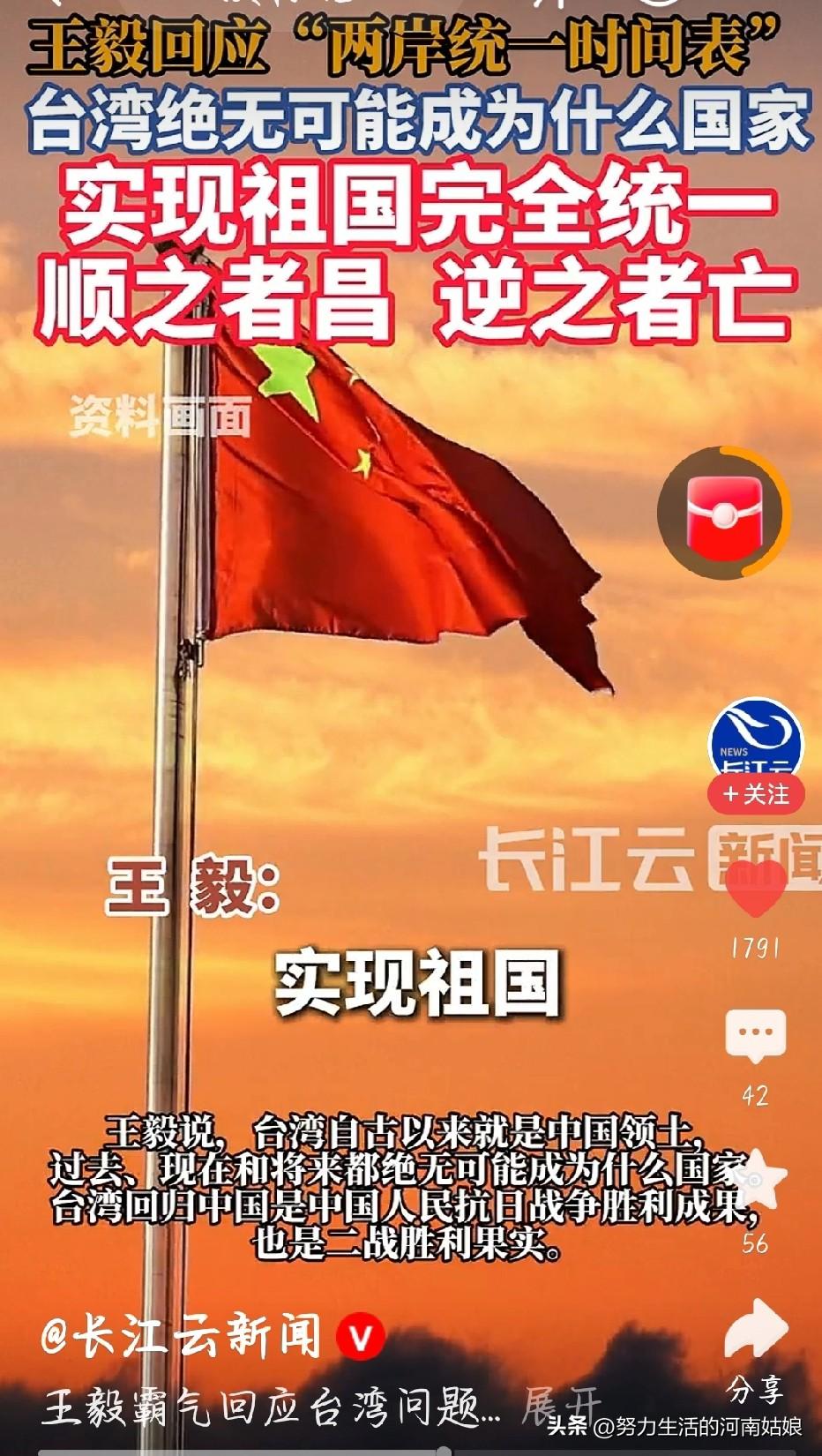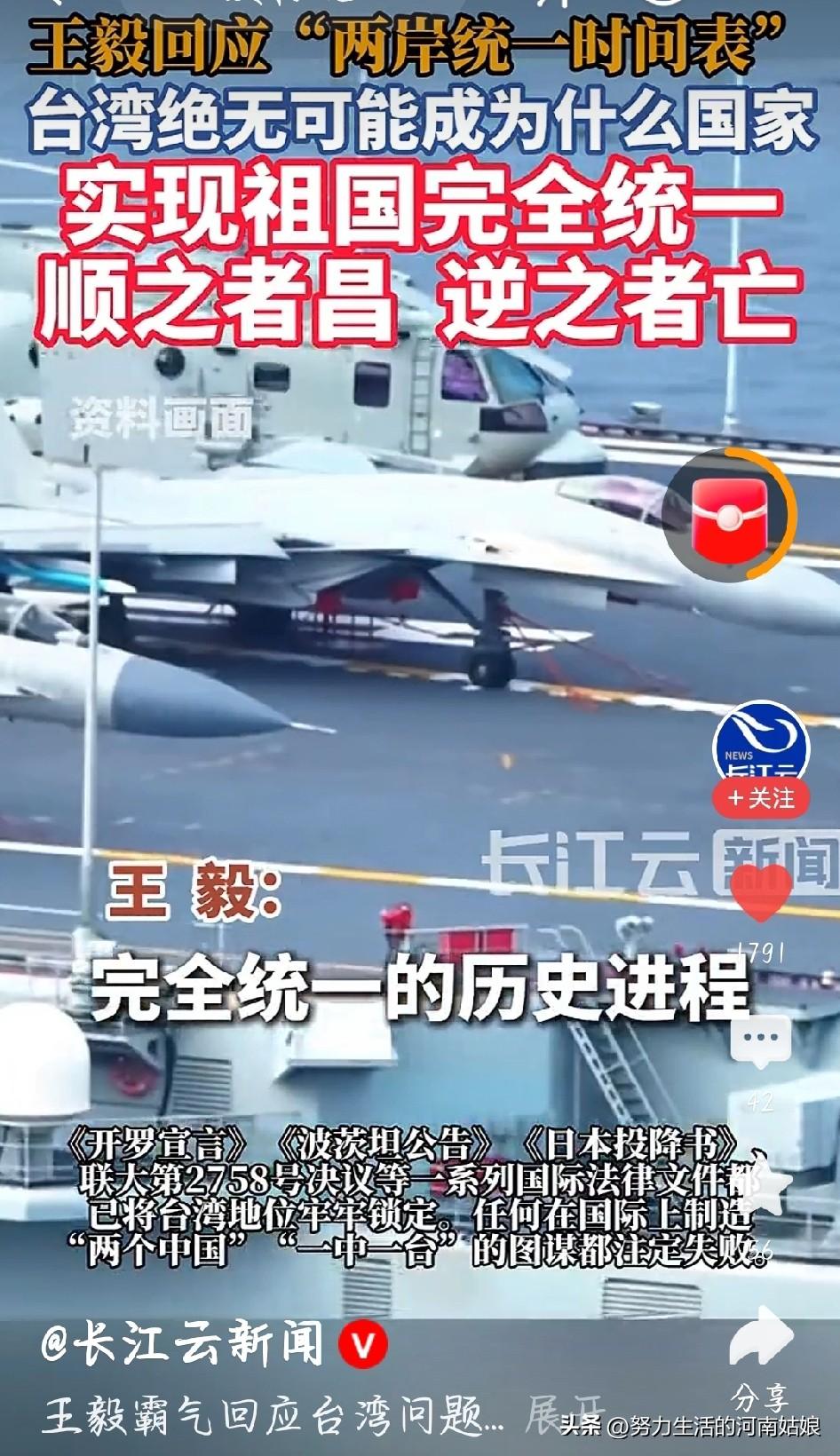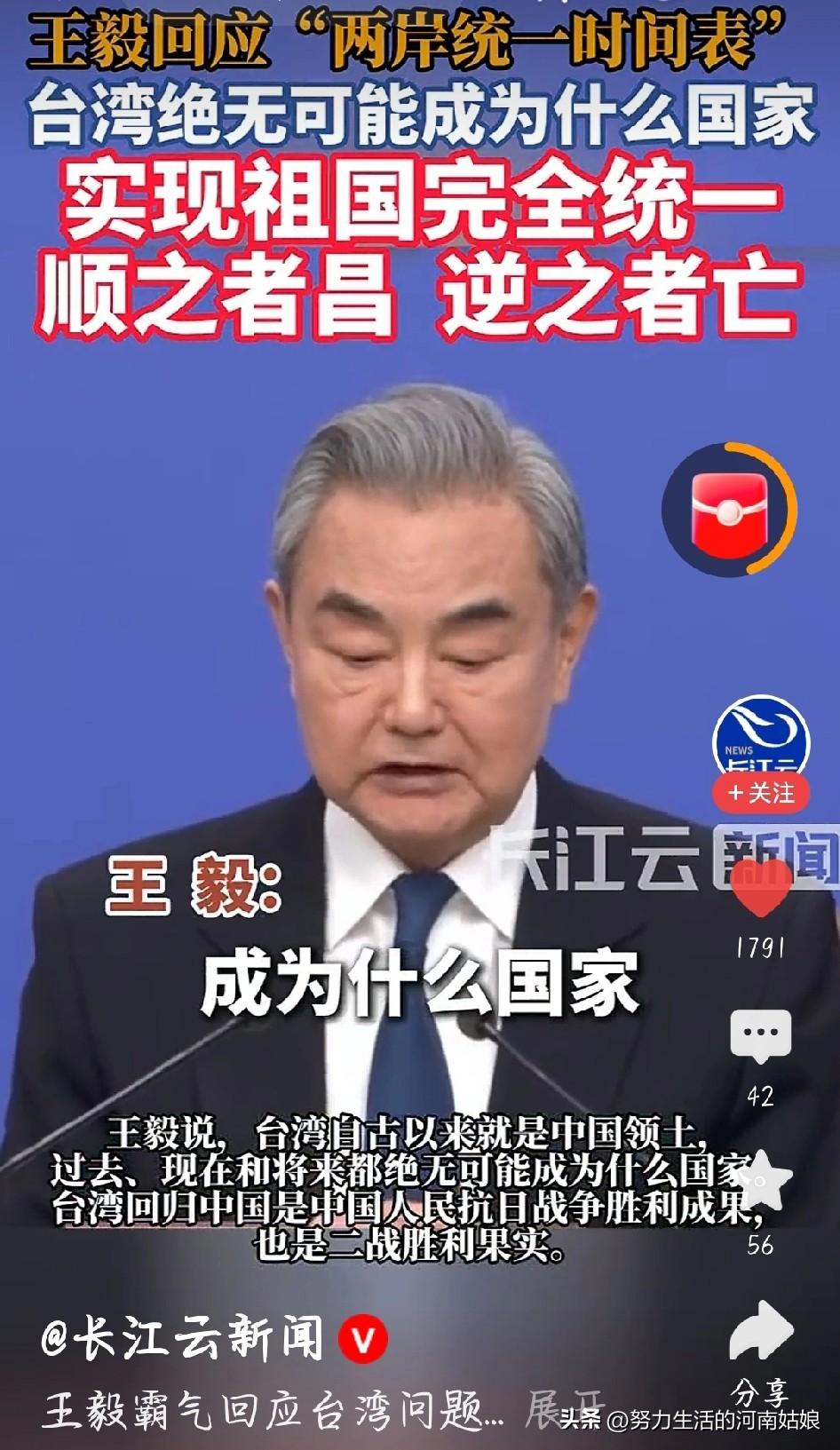 我刚看完王毅外长回应两岸统一时间表,用大白话给大家说清楚,不绕弯、不夸张,句句实在👇 大家都在问统一有没有时间表,我听完最直接的感受就是:不用问哪天,答案只有一个——必须统一、必然统一、谁也挡不住。 台湾本来就是中国的地方,这是老祖宗留下的,是历史定死的,也是全世界都承认的事实。不是谁想改就能改,更不是少数人闹一闹就能变的。 有人总拿“时间表”说事,其实不用刻意定日子,因为统一是大势,是人心,是早晚的事。我们不想打仗,希望平平安安回家,但底线清清楚楚:谁敢搞“台独”,谁敢插手干涉,我们绝不答应,14亿中国人都不答应。 台湾问题是我们自己家里的事,外人没资格指手画脚。不管过多久,不管遇到什么干扰,回家的路不会变,统一的脚步不会停。 作为一个中国人,我信一句话:台湾终将回到祖国怀抱,中国必须完全统一,也一定能完全统一。 王毅回应“两岸统一时间表” 王毅回应两岸统一时间表, 台湾是中国的 两岸必须统一 祖国统一大势所趋 台湾统一最有可能以什么样的方式 图片截图于长江云新闻