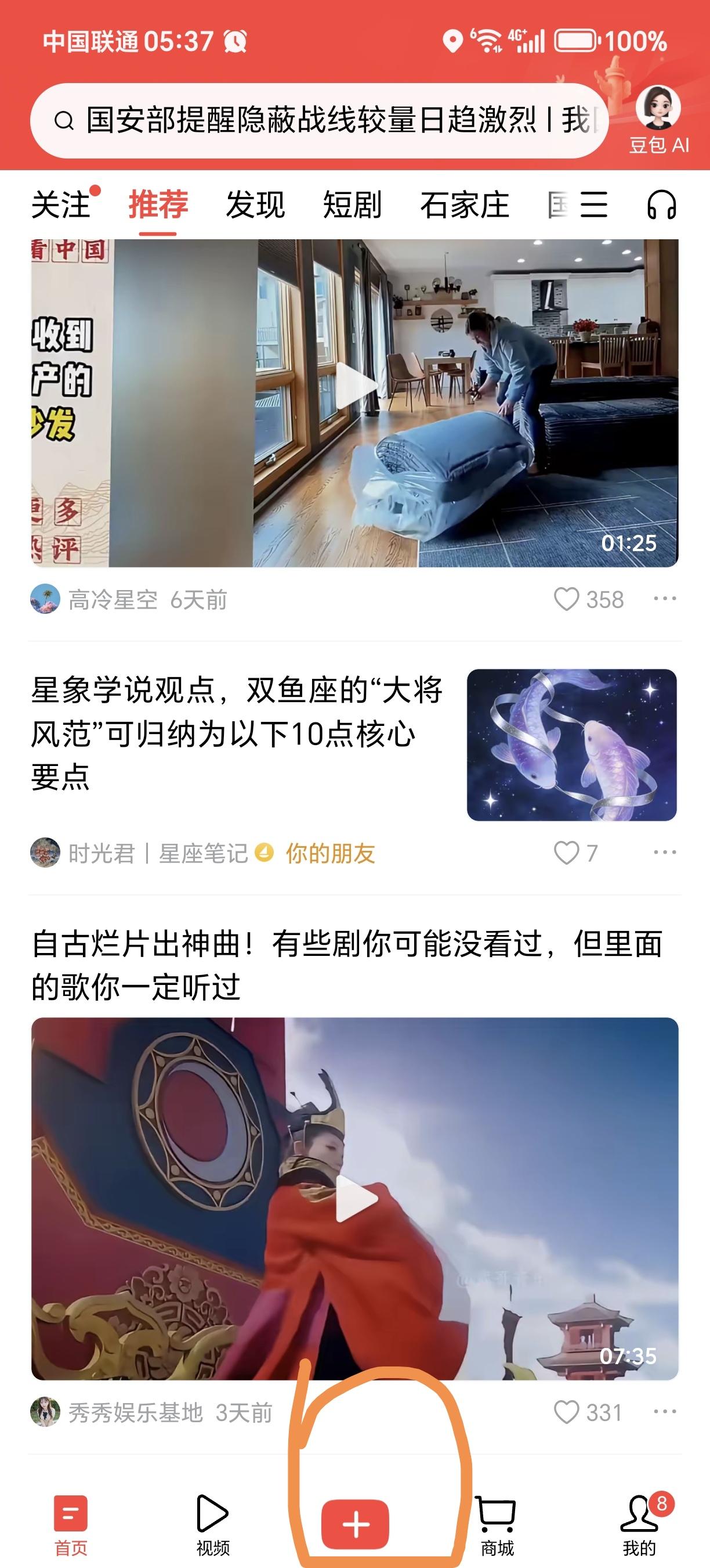 突然发现头条上发文的按钮变了!原来发文的那个加号在右上角,现在变成下面中间,和抖音的位置一样了!这个位置比原来更醒目,更容易看到。 过了年之后,我的懒劲这么长时间过不去,很少在头条上写东西,前两天打起精神好不容易写了两篇,不知道为什么审核不通过,又把这写作热情打下去了[大笑] 今天又给自己鼓鼓劲,准备写几个字,没想到发现了头条这个变化,还是红色的,很挺喜庆的!新的一年,也祝头条越办越好吧!