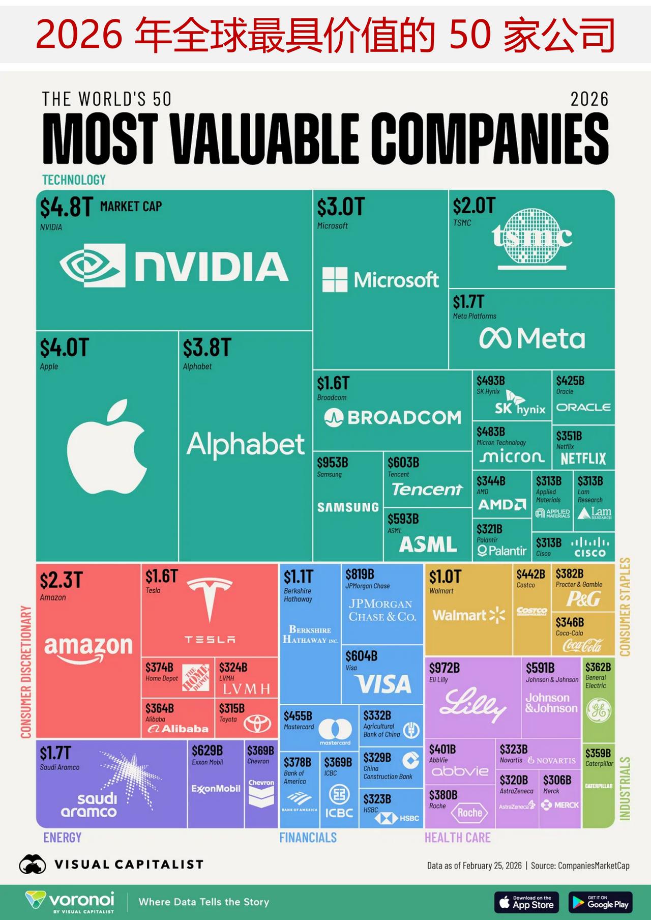 2026 年全球最具价值的 50 家公司是哪些? 英伟达公司的市值高达 4.8 万亿美元,预计在 2026 年将成为全球最具价值的公司。 尽管存在对人工智能泡沫的担忧,但该公司再次超越了苹果和 Alphabet,得益于创纪录的销售额,其市值也随之上升。与此同时,台积电的 2 万亿美元市值现已超过了 Meta 平台和特斯拉,位居全球第六位。通过参考“公司市值”数据库中的数据,下面图表展示了 截至 2026 年 2 月 25 日按市值计算的规模最大的的 50 家公司。 作为全球最大的上市公司,英伟达近期公布了创纪录的 681 亿美元季度营收,较去年同期增长了 94%。 该公司最大的客户包括 OpenAI、甲骨文和微软等企业,一系列强劲的财报使其市值逼近 5 万亿美元。然而,由于投资者对估值过高的担忧,股价涨幅受到了抑制。 苹果、Alphabet(谷歌母公司)和微软紧随其后,每家公司的市值都约为 3 万亿美元或更高。 沙特阿美是排名前十的公司中仅有的两家非美国企业之一,其估值达 1.7 万亿美元,位列第七。油价的下跌对其业绩造成了影响,其股价较 2022 年的峰值下跌了约 30%。除沙特阿美,另外进入排名前十的非美国企业是中国台湾的芯片制造公司台积电,其估值达 2.0 万亿美元,位列第六。 与此同时,芯片设计公司博通的市值接近 1.6 万亿美元,排名第九。除了为 OpenAI 和 Meta 生产定制的人工智能加速芯片外,它还为谷歌设计了张量处理单元(TPU)。 如今,博通正日益成为英伟达的强劲竞争对手,与谷歌(排名第 3)和超威半导体(排名第 38)等公司一道,随着大型科技企业计划在 2026 年仅这一年内就投入 6500 亿美元用于人工智能基础设施建设,这一局面愈发凸显。