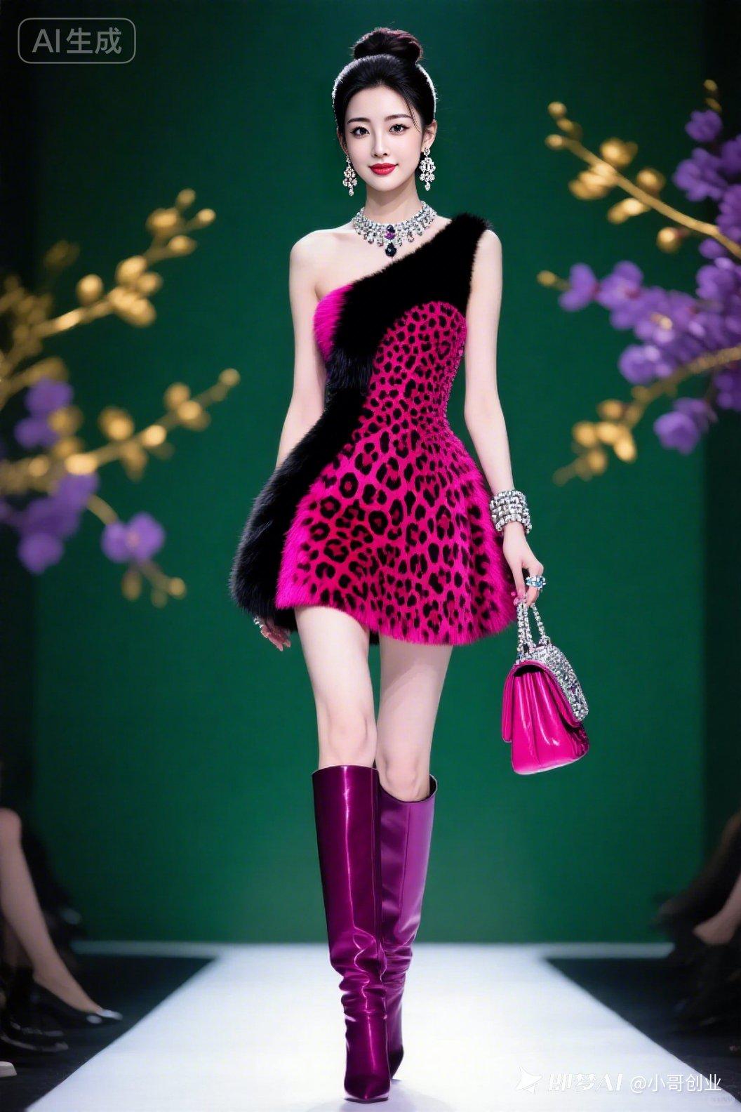 1.9米高挑佳人,丹凤眼明眸皓齿,冷白皮精致淡妆,高颅顶发髻尽显气场。身着豹纹荧光玫黑皮草拼接钻饰蓬蓬裙,配同色长靴名包与重工珠宝,T台走秀,暗绿金紫梅景超高清夺目。