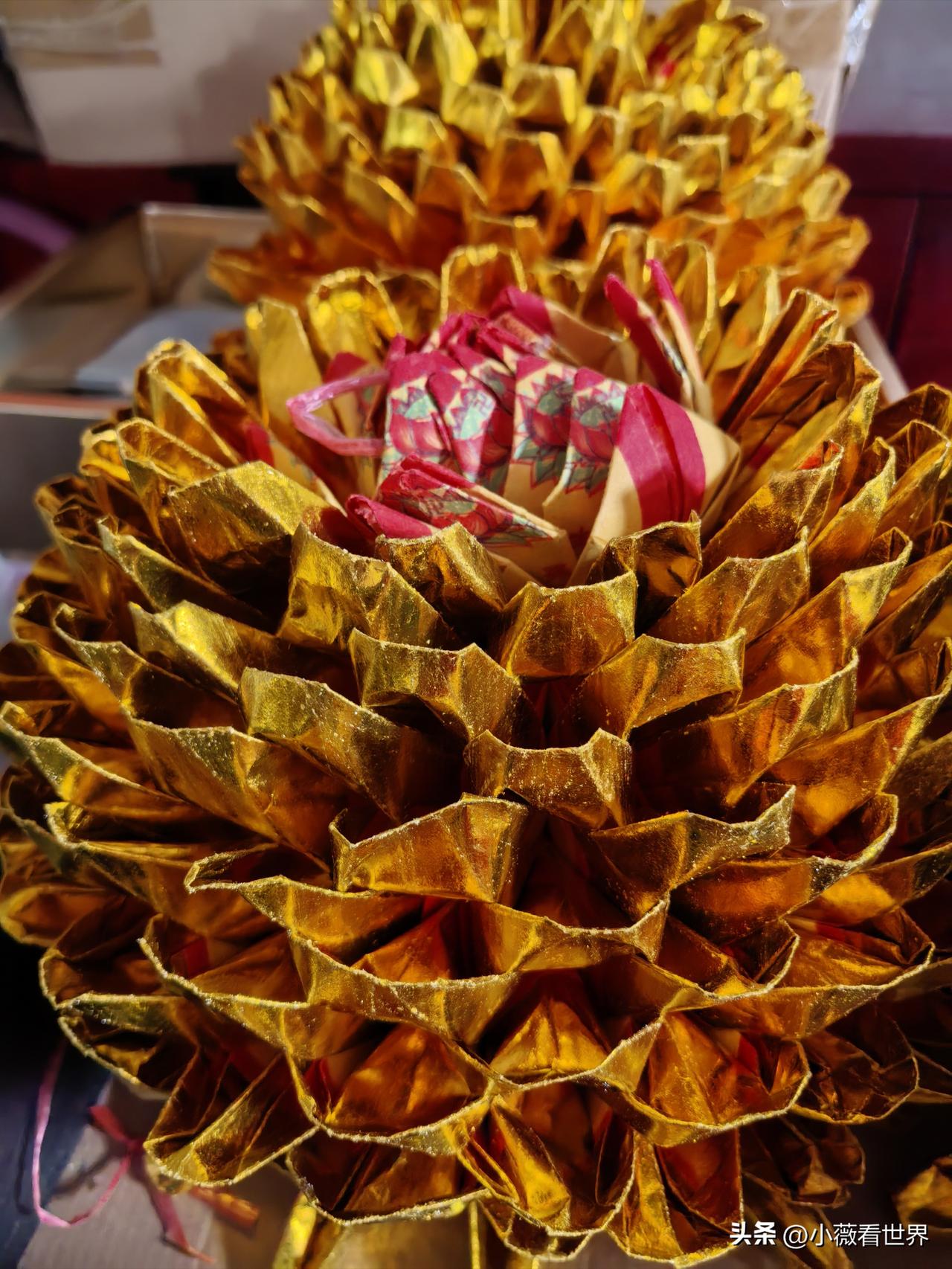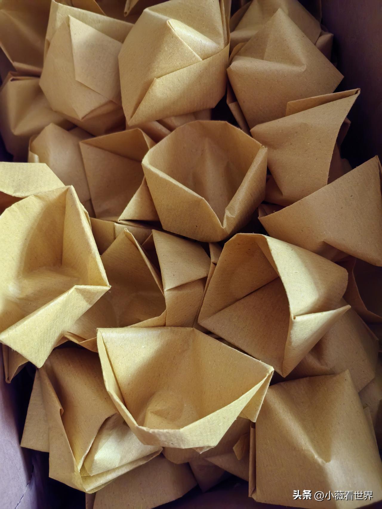 最近我老妈有点忙,元宵节过后,距离清明节也就不远了。 我们这里过年时,只在家里祭奠祖宗故人,但清明前大半个月中,必定会选一个日子去上坟。 去上坟必定要带纸钱过去。我们这里最流行图13这种金元宝,一般都是买回黄纸后,自己抽空在家里做。 家里有老人的,他们有空就会在家里造。那些实在没有时间自己做的人,街里香烛店也有现成的一袋子一袋子卖。 图2这个叫金宝塔,按照他们说法在那边可值钱了,不过很费工夫,一般人还做不起来。 我老妈心灵手巧,不光给自己家做,还帮别人家做。毕竟给死去的人多点钱花,是我们大家的心愿。友友,马上清明节了,你们那里也会这样造钱么?