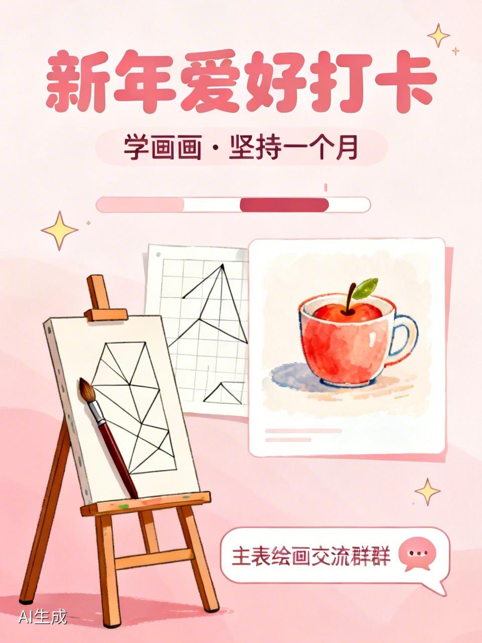 新年爱好打卡进入阶段总结啦!我这新年立下的学画画flag,到现在已经坚持一个多月。一开始连线条都画不直,现在能临摹简单的小插画。 我每天至少花一小时在画画上,从基础的几何图形练起,再到画小物件,像杯子、苹果啥的。为了提升,还加入了绘画交流群,看大神作品找灵感。 不过也有想放弃的时候,比如画复杂图案总出错。但坚持下来,看到自己的进步,超有成就感。接下来继续加油,争取画出更棒的作品!