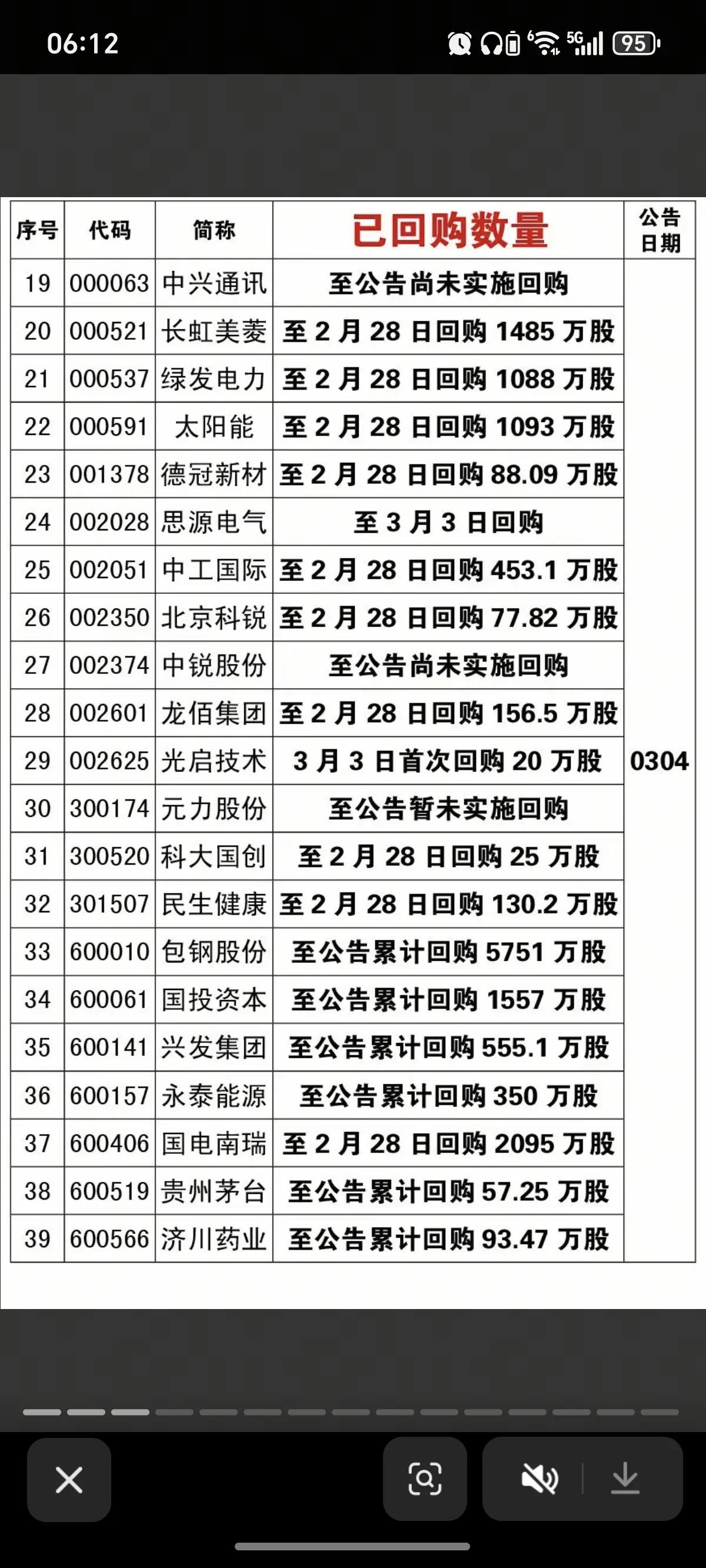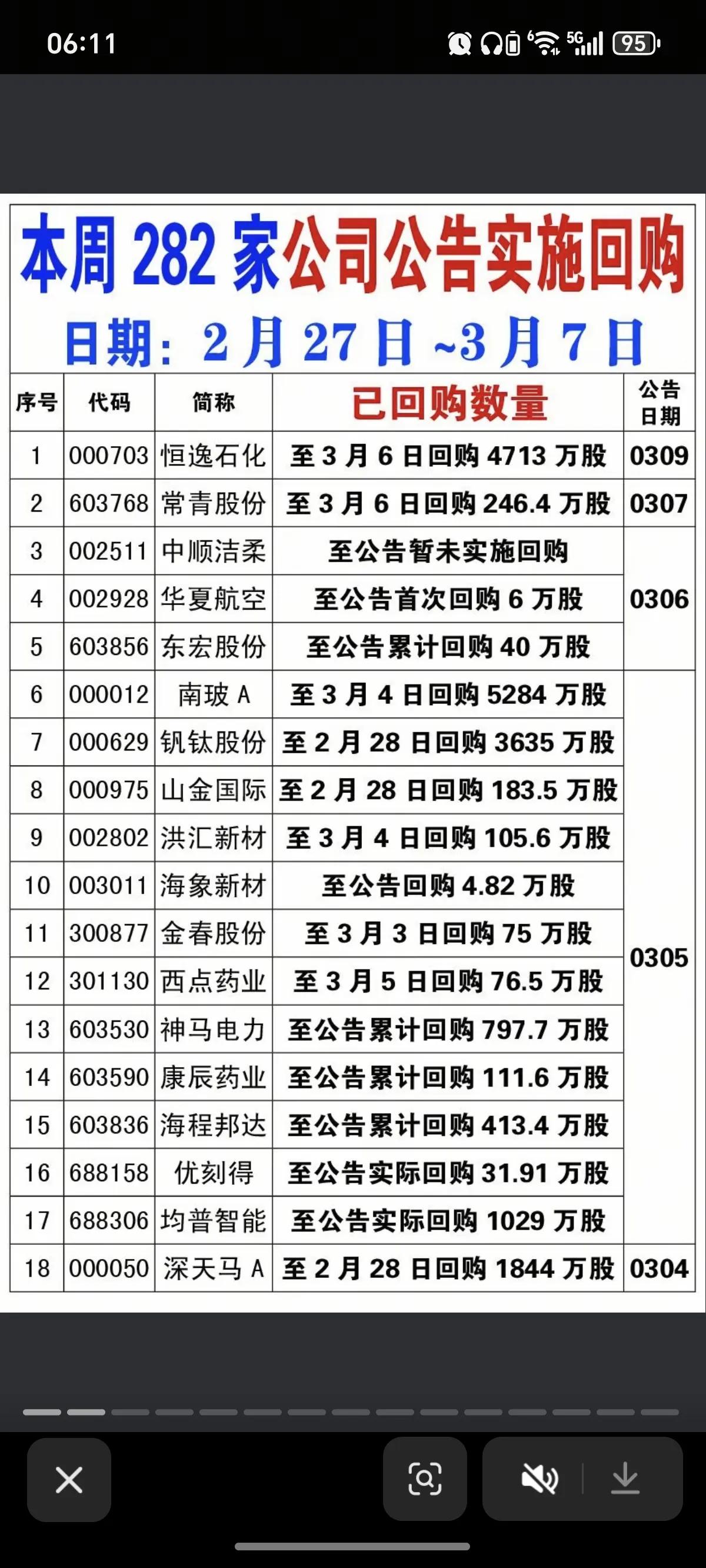 本周A股回购潮分析📈 2月27日至3月7日,A股共有282家公司公告实施回购,彰显产业资本对市场的信心。从数据看,回购呈现出“头部集中、行业广泛”的特点。 在回购规模上,包钢股份以累计回购5751万股位居榜首,恒逸石化(4713万股)、南玻A(5284万股)、钒钛股份(3635万股)等传统行业龙头也出手阔绰,显示出对自身价值的坚定认可。同时,贵州茅台等消费龙头也加入回购行列,进一步提振了市场情绪。 从进展看,大部分公司已实质性回购,但也有中兴通讯、中顺洁柔等公司尚未实施,后续进展值得关注。整体而言,本轮回购潮在一定程度上缓解了市场减持压力,为投资者提供了积极信号,也反映出上市公司对未来发展的信心!!!