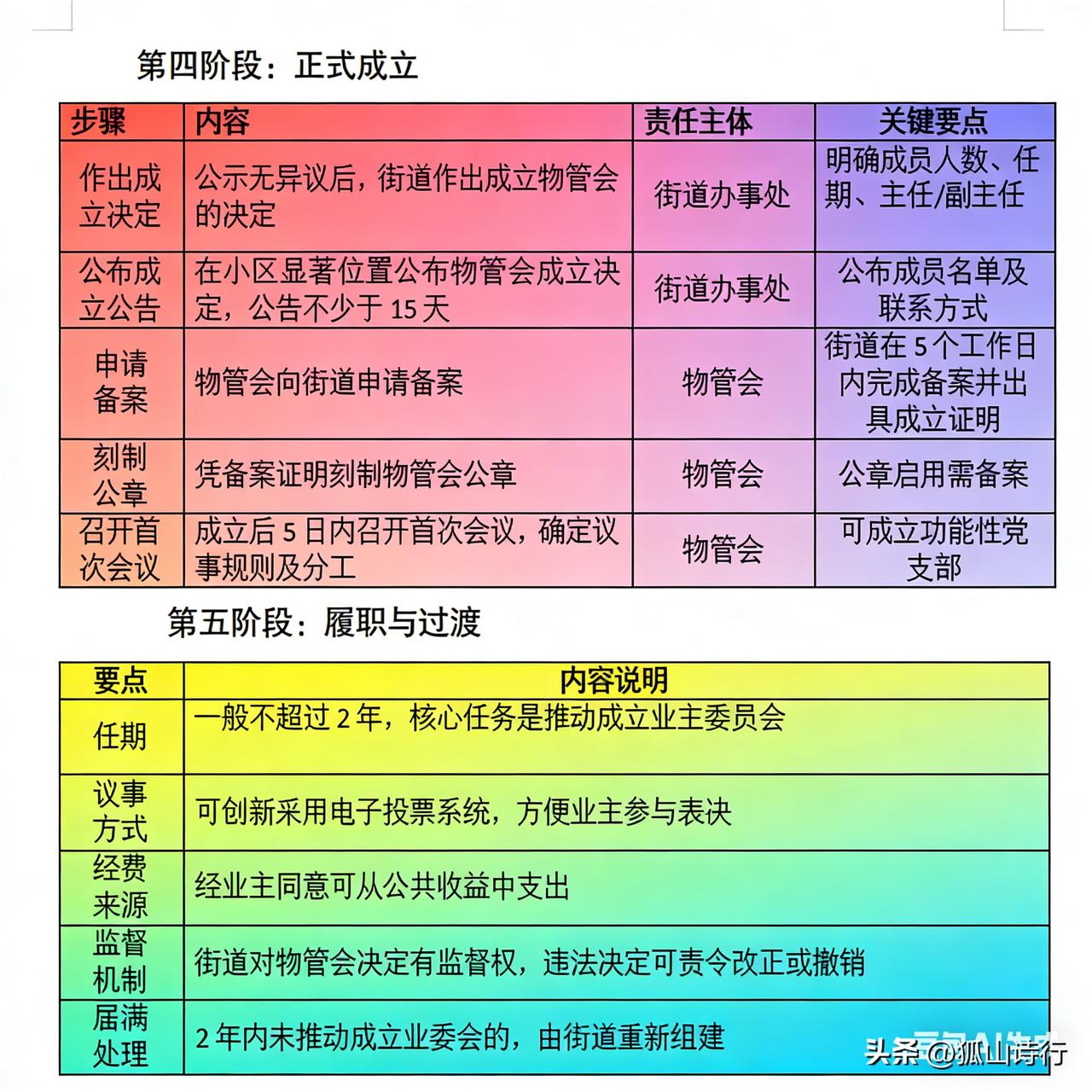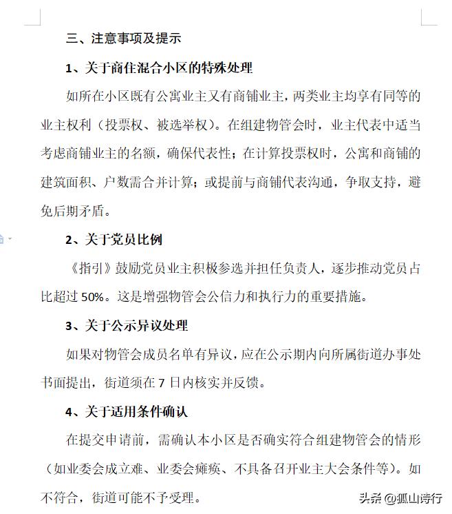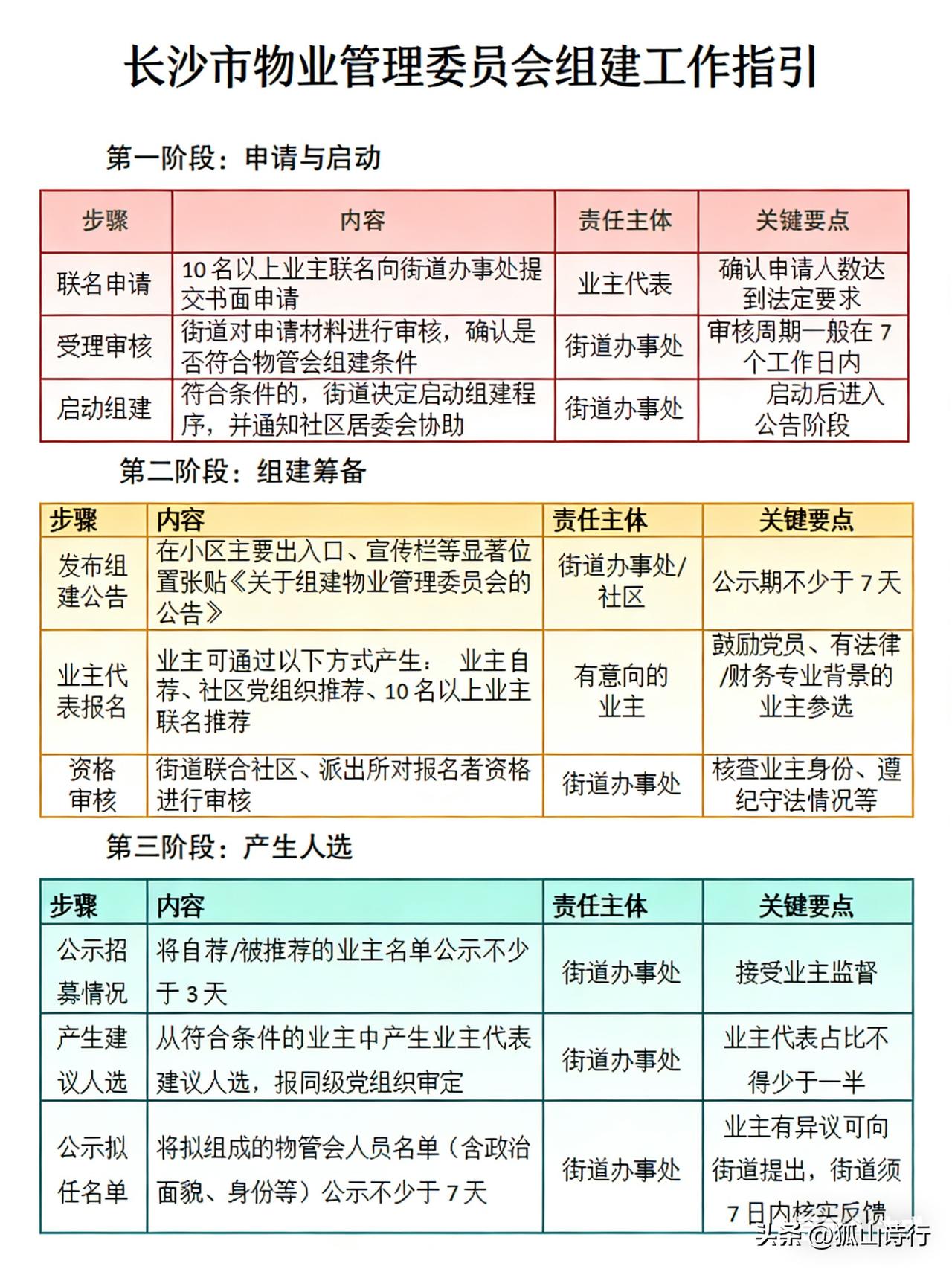 长沙市物业管理委员会成立流程 根据《长沙市物业管理委员会组建工作指引(试行)》及相关政策,物管会组建分为以下五个阶段:(详见表格图) 三、注意事项及提示 1、关于商住混合小区的特殊处理 如所在小区既有公寓业主又有商铺业主,两类业主均享有同等的业主权利(投票权、被选举权)。在组建物管会时,业主代表中适当考虑商铺业主的名额,确保代表性;在计算投票权时,公寓和商铺的建筑面积、户数需合并计算;或提前与商铺代表沟通,争取支持,避免后期矛盾。 2、关于党员比例 《指引》鼓励党员业主积极参选并担任负责人,逐步推动党员占比超过50%。这是增强物管会公信力和执行力的重要措施。 3、关于公示异议处理 如果对物管会成员名单有异议,应在公示期内向所属街道办事处书面提出,街道须在7日内核实并反馈。 4、关于适用条件确认 在提交申请前,需确认本小区是否确实符合组建物管会的情形(如业委会成立难、业委会瘫痪、不具备召开业主大会条件等)。如不符合,街道可能不予受理。 物业制度改革