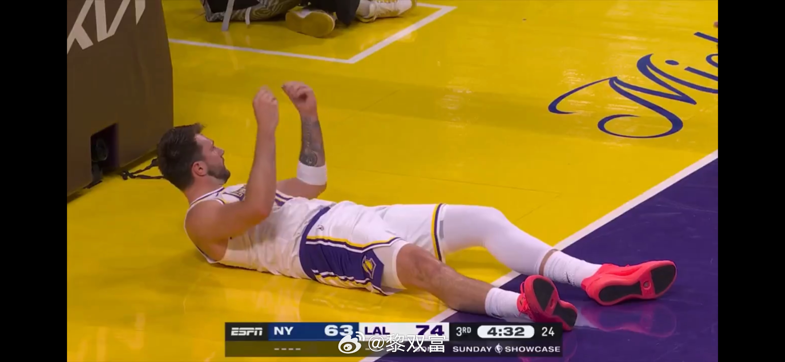 詹姆斯缺阵,卢卡35+8+4,湖人主场拿下尼克斯,在一次篮下造犯规未获得哨声后,他疑似朝裁判做出数钱动作。