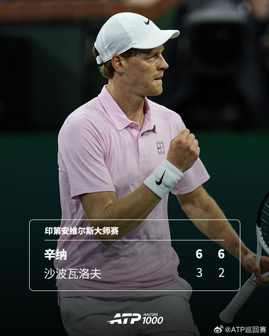 ATP1000 印第安维尔斯大师赛第三轮,2号种子辛纳以6-3 6-2力克沙波瓦洛夫,第五次跻身赛会16强,接下来将对阵保罗与丰塞卡的胜者。