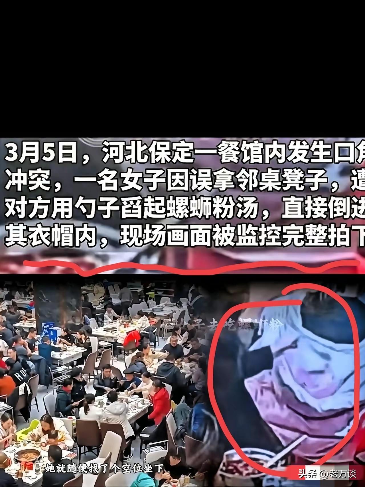 河北保定黑衣女子行为让人毛骨悚然,碰到这样人,真的要远离她。千万不要正面激怒她,该报警就报警,该走正规程序走正规程序,千万不要给自己正面硬扛,这位女子完全就是无事找事,这位女子真的是做得太过分了在。河北保定某螺狮粉店,穿白色衣服女子进来时,发现旁边桌上并没有顾客就餐,顺手就拿过了旁边的椅子拉过来就坐。不久,一名穿黑色的衣服女子走过来,看到自己凳子不见了,就大喊大叫破口大骂,白色衣服女子就说,这是你的凳子,我不知道,就把凳子还给了这位黑色衣服女子,为此二人还发生了争执,最后在店员的调停下,双方相安无事。本以为这件事情就这样过去了,白色衣服女子就坐在黑色衣服女子背后安心地吃螺蛳粉。恐怖的一幕发生了,黑色衣服女子在吃螺蛳粉的时候,拿着汤勺一勺一勺把螺蛳粉里面的汤打到白色衣服女子衣帽里,造成了白色衣服女子衣服严重损坏,白色衣服女子立马报警。这是监控拍下的一幕,黑色衣服女子做的实在是太过分了,太闷骚了,怎么能做这样的事情,完全就是不考虑后果。如果是滚烫的,岂不是要伤到白色衣服女子了,这可是故意伤害罪。再说,白色衣服女子并不是故意要占用黑色衣服女子就坐的凳子,而且人家也当面赔礼道歉了,黑色衣服女子怎么能如此呢?这一下黑色衣服女子可能被关几天是轻的,而且还要赔偿白色衣服女子的精神和经济损失,最关键的是,这样的人谁敢跟她交朋友?这样的人情绪如此的不稳定,心机如此之深,破坏力如此之大,以后谁敢招惹她。