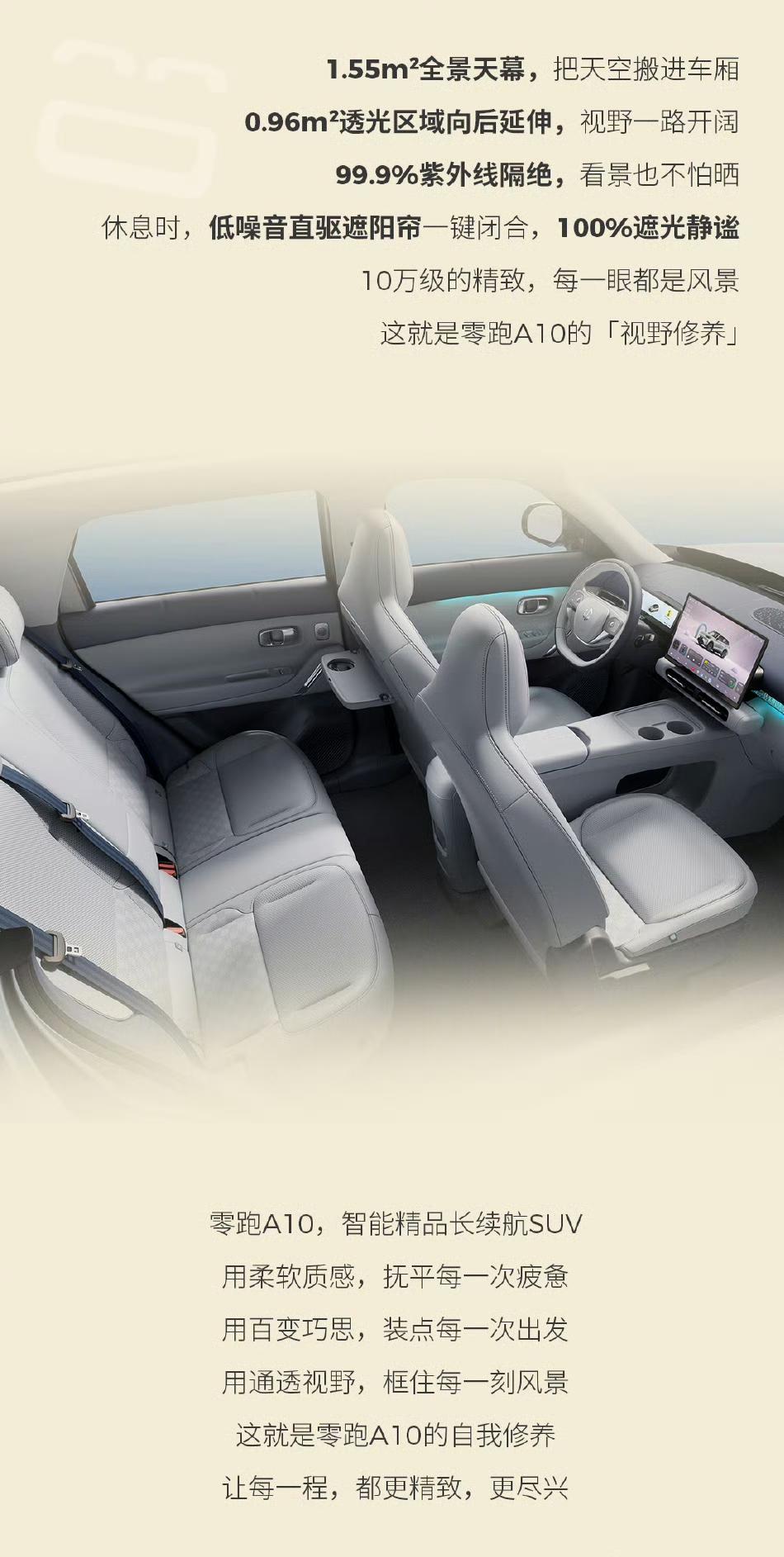 谁懂啊!10万级SUV居然能把「视野+格调+质感」玩得这么绝,零跑A10这波直接把同级卷麻了! 🌤️ 视野修养:把天空搬进车厢 1.55㎡全景天幕+0.96㎡透光区向后延伸,抬头就是整片蓝天,连副驾都能沉浸式看风景! 99.9%紫外线隔绝,夏天看景也不怕晒黑,休息时一键闭合低噪遮阳帘,100%遮光秒变私密空间,午休都能睡成小猪🐷 🎨 格调修养:把仪式感拉满 首创百变悬浮式IP Bar,右端还留了DIY接口!氛围灯、香薰机随便装,每天换着花样玩,出行再也不无聊~ 还有全新小零形象藏在内饰角落,每次发现都是小确幸,这陪伴感直接戳中少女心💖 🧶 质感修养:把疲惫统统抚平 座椅和内饰用了软乎乎的亲肤材质,坐进去像陷进云朵里,长途开车也不觉得累。 10万级的价格,却有越级的精致感,每一处细节都在说:“这才是年轻人想要的车!” 零跑A10,智能精品长续航SUV,让每一趟出行都更尽兴、更精致~ 预算10万的姐妹,这波真的可以冲!💨