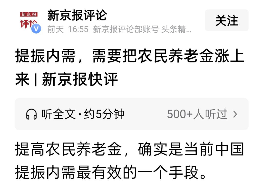 新京报的这句话说在了点子上。 近日,新京报刊发文章称,提高农民养老金,确实是当前中国提振内需最有效的一个手段。 文章强调,提振内需,需要把农民养老金涨上来。我觉得,这句话抓住了问题的要害。 近年来,多位专家学者呼吁,要提高农民的养老金,改善农民的养老待遇。之所以这么提,主要基于两点考虑。 其一,目前农民养老金确实偏低,国家基本养老金的标准每月只有200元,不用说应对养老,就是满足日常基本生活需求都够呛。 不少农民为国家的建设发展做出过奉献和牺牲,在他们年老的时候,理应获得必要的保障,让他们可以快乐而有尊严的生活。 其二,由于目前农民养老金水平偏低,消费受到抑制。养老金上涨以后,绝大多数老人会将这部分资金用于改善生活,有利于进一步刺激消费。 而且,我国1.8亿领取养老金的农民是一个十分庞大的群体,农民养老金上涨以后,通过消费对提振内需的作用显而易见。