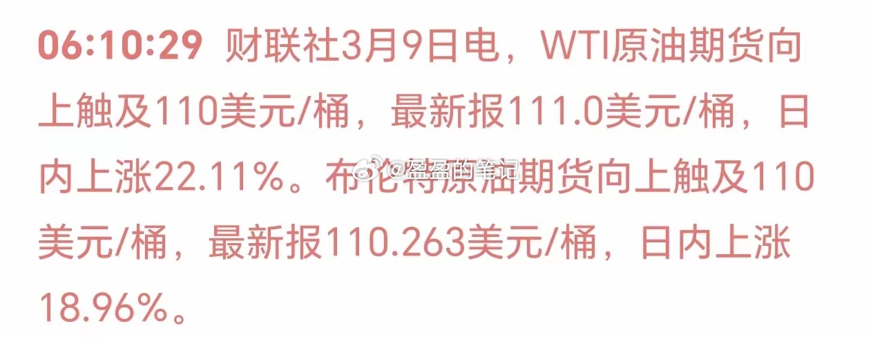 早晨8点0分,刚刚被手机消息震醒:原油期货大涨22%!一下就破了110美金,美国赚翻了!细想,现在只有美国天然气和石油敞开了卖,所以特朗普说市场不缺石油。这次,美国赚翻了!中东三方还在鏖战,石油还要涨!世界不太平,因为有坏人!爱好和平的我们,真的要紧握手中枪!周一两大热点:一是石油天气热煤炭股;二是什么龙虾概念!