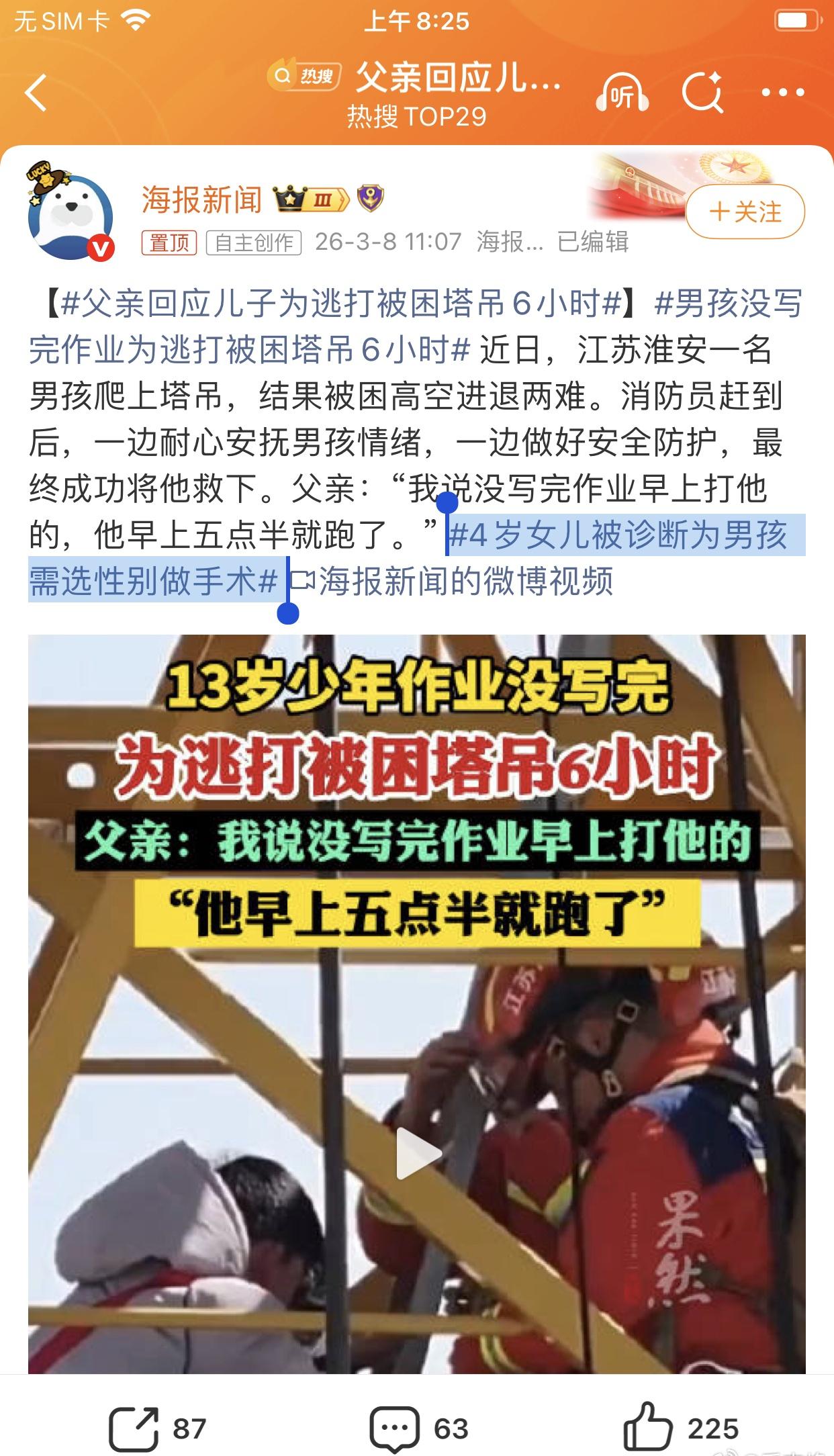 媒体蹭话题,是否违规?……→_→【父亲回应儿子为逃打被困塔吊6小时】男孩没写完作业为逃打被困塔吊6小时 近日,江苏淮安一名男孩爬上塔吊,结果被困高空进退两难。消防员赶到后,一边耐心安抚男孩情绪,一边做好安全防护,最终成功将他救下。父亲:“我说没写完作业早上打他的,他早上五点半就跑了。”