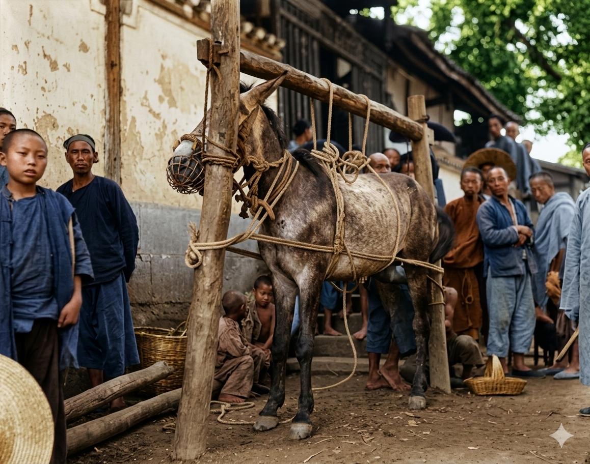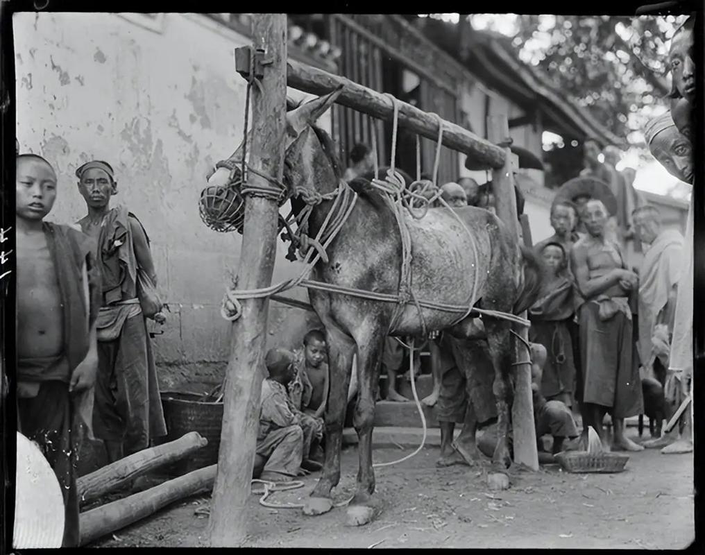 这张照片是美国社会学家西德尼·甘博于1917-1919年间,在重庆铜梁县拍摄的为驴钉马掌。 照片中,一头驴被牢牢地固定在一个木制的“马桩”上,嘴部被罩住,以防止它在操作过程中挣扎伤人。 为何要钉掌?重庆地区多为崎岖的山路和石板路,驴作为重要的运输和交通工具,其蹄子在坚硬路面上会快速磨损。为驴装上铁制的“马掌”,可以有效保护驴蹄,延长其使用寿命,同时也能让它在湿滑路面上抓地更稳。 为何是驴而不是马?在西南地区,驴比马更能适应崎岖的山路和恶劣的环境,饲养成本也更低,因此成为了当地百姓更普遍的选择。