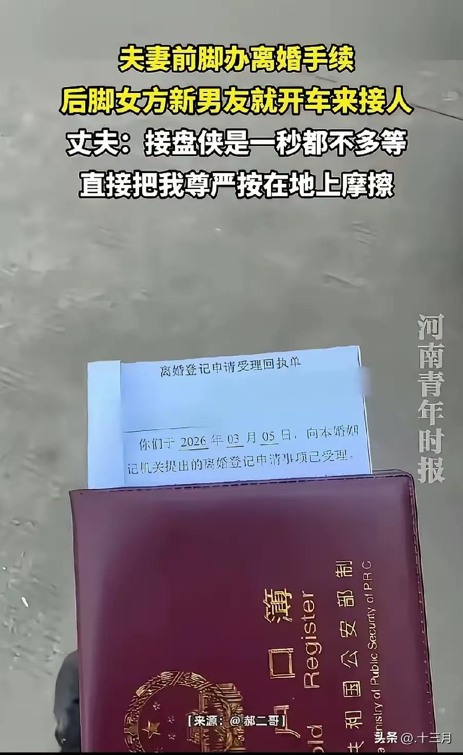 陕西一男子上网哭诉,自己刚和妻子去婚姻登记处登记离婚,还不是正式离婚,还有一个月的冷静期。按理来说双方还保持着婚姻关系,但妻子就迫不及待的想让接盘侠转正了。刚从婚姻登记处出来,妻子的接盘侠就在门口等着妻子,妻子也不管丈夫,看都不看丈夫一眼,上了接盘侠的车走人了。 男子站在原地,手里还攥着刚打印出来的离婚登记申请受理回执单,指节都捏得发白。他原本还想着,趁着这一个月冷静期,或许还能找机会和妻子好好聊聊,看看这段婚姻有没有挽回的余地,可眼前这一幕,把他最后一点念想砸得稀碎。他对着镜头红着眼眶说,感觉自己的尊严被按在地上反复摩擦,对方连多等一秒都不愿意,仿佛这段婚姻从一开始就是个笑话。 视频传到网上后,评论区瞬间炸了锅。不少网友替男子抱不平,说女方的做法太过分,哪怕感情走到尽头,也该给彼此留最后一点体面,更何况还在冷静期内,这种迫不及待的姿态,摆明了早就做好了离开的准备。也有人翻出“接盘侠”这个词说事,觉得男子用带有侮辱性的词汇称呼女方的新伴侣,本身就带着情绪,未必是客观的叙述。 有人理性分析,说从法律层面讲,冷静期内双方还是夫妻,女方此时和他人以情侣身份相处,确实违背了夫妻间的忠实义务,哪怕没到违法的程度,道德上也站不住脚。可也有人觉得,感情的事从来不是非黑即白,或许这段婚姻早就名存实亡,女方只是不想再耗着,才选择了这样的方式,只是做法太激进,没顾及到男子的感受。 男子的哭诉里,藏着太多不甘和委屈。他可能没想过,曾经朝夕相处的人,会用这么决绝的方式和自己划清界限,连最后一点缓冲的时间都不肯给。可换个角度想,当一个人连伪装都懒得做,恰恰说明这段关系早就没有了留恋的必要,与其在破碎的婚姻里互相折磨,不如早点看清现实,及时止损。 也有人提醒男子,与其在网上卖惨,不如趁着冷静期整理好财产、收集好证据,用法律武器维护自己的权益。毕竟情绪发泄解决不了问题,真正能让他站起来的,是把属于自己的东西拿回来,然后好好开始新的生活。 这件事也给所有人提了醒,婚姻不是儿戏,无论是开始还是结束,都该守住基本的底线和体面。不爱了可以分开,但没必要用伤人的方式宣告结束,既贬低了过去的自己,也给对方留下难以愈合的伤口。 各位读者你们怎么看?欢迎在评论区讨论。