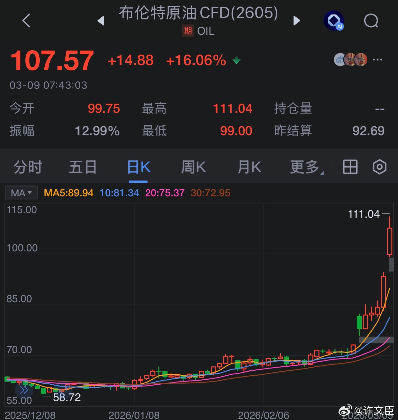 每天早起打卡老板们早安,打卡养铁咯油价突破107,今天的行情一定会很刺激许文臣