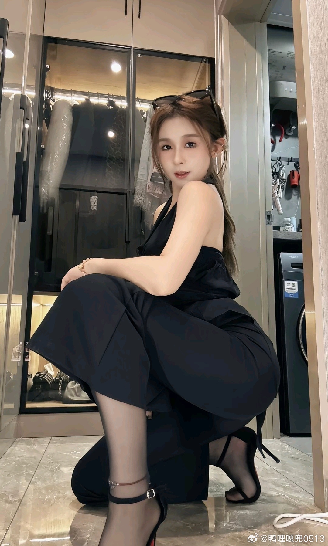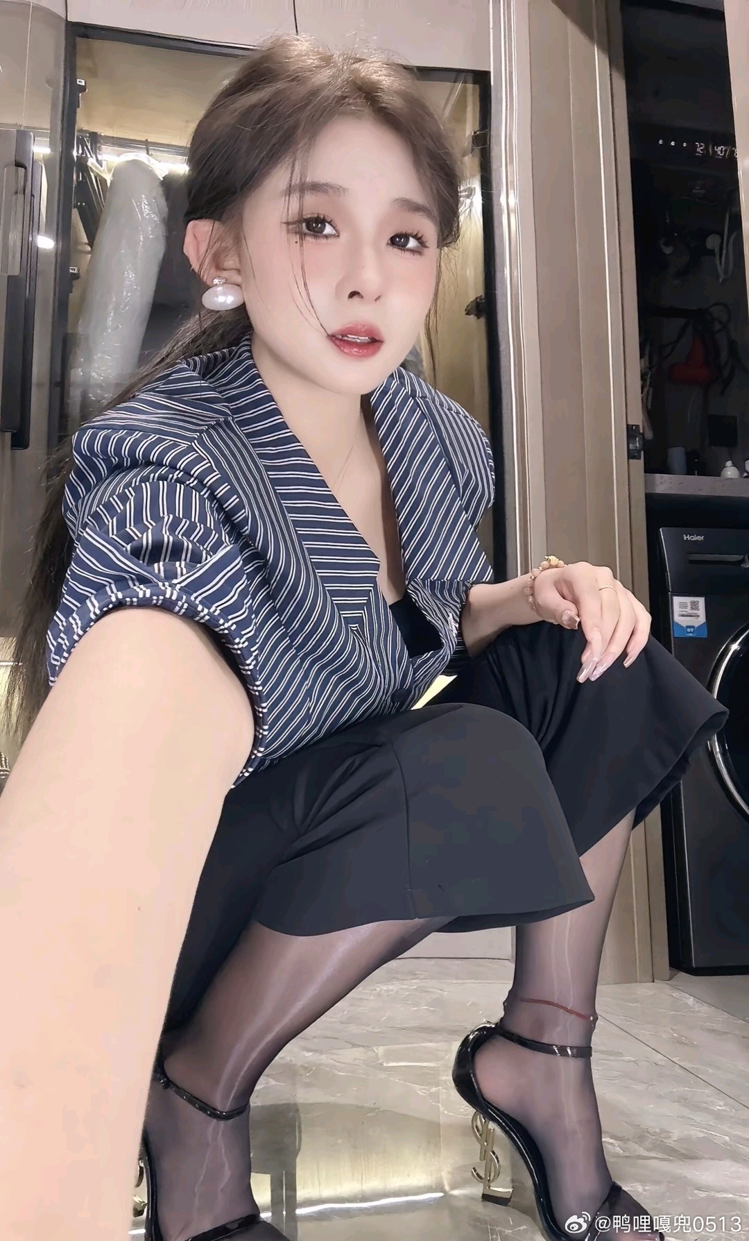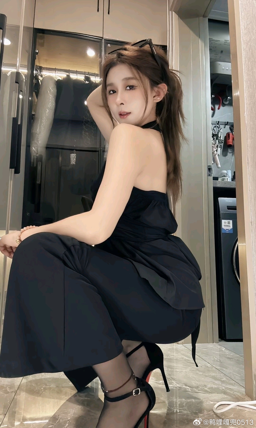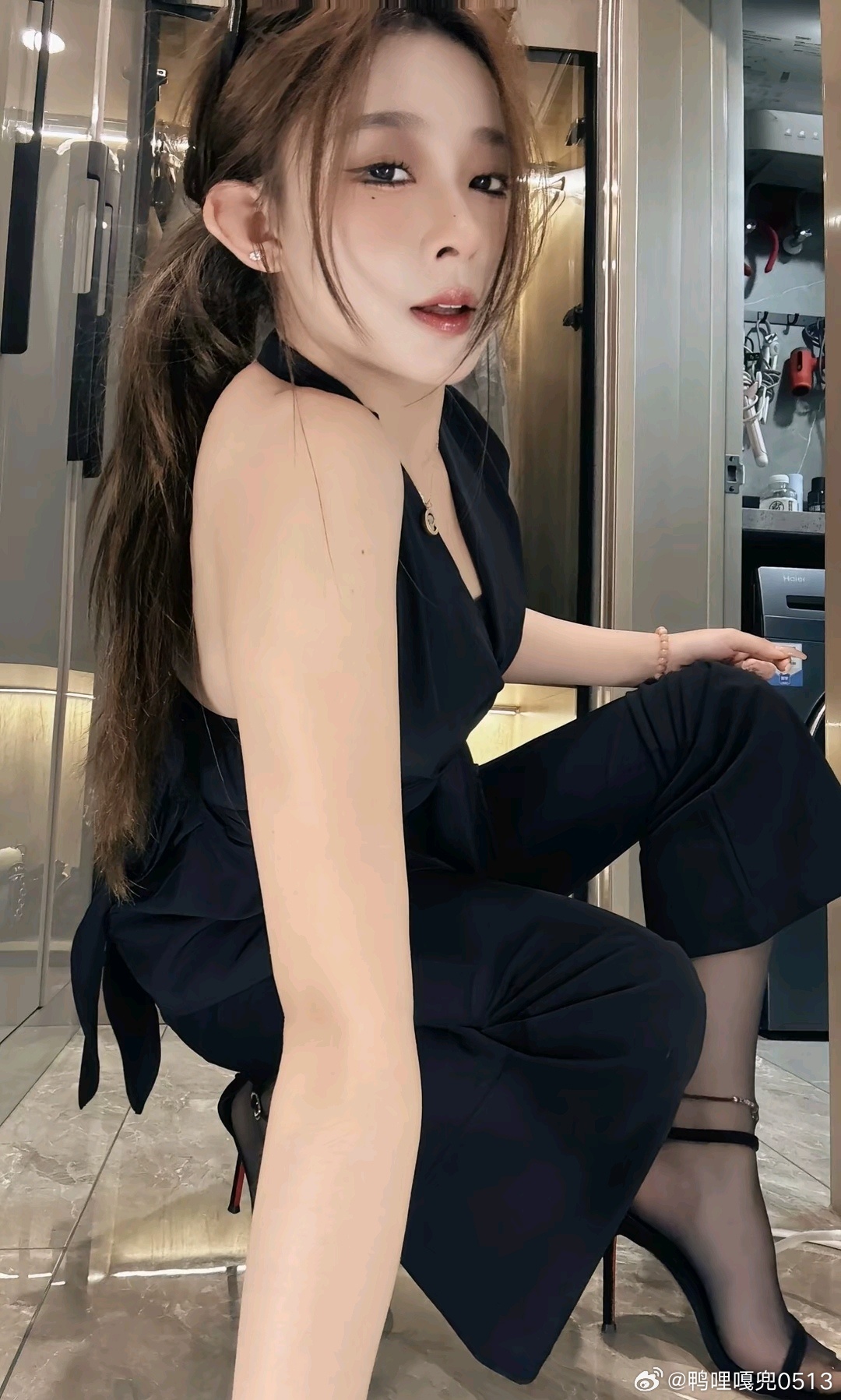写真 黑色挂脖露肩上衣和条纹衬衫御姐气质拉满