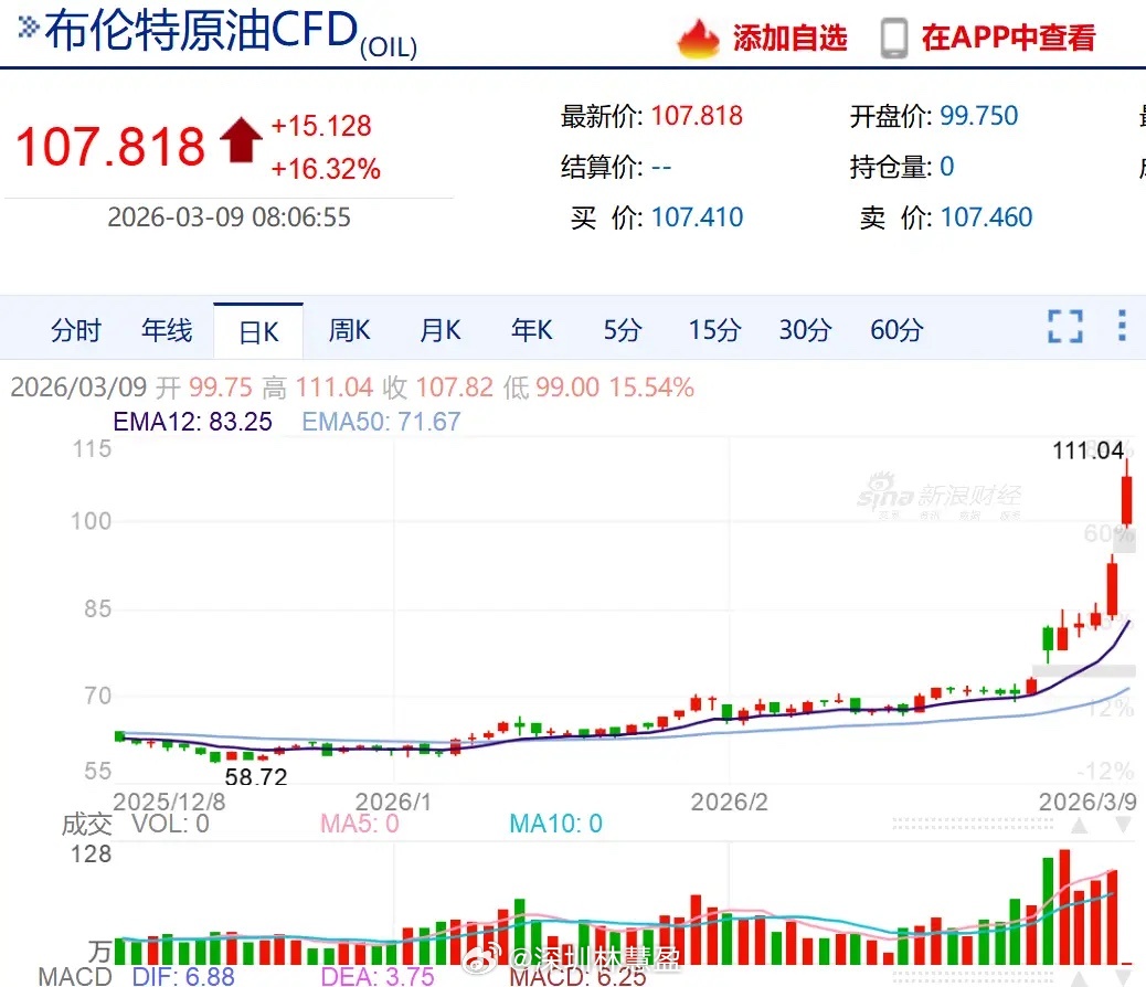 美伊大战越打越凶,军迷看得兴奋,投资者却越来越慌。上周五国际油价暴涨,布伦特原油突破 90 美元,今天一早直接冲上 110 美元。高盛数据显示,波斯湾原油及成品油出口每日受损高达 1700 万桶,接近霍尔木兹海峡正常流量的九成,是 2022 年俄罗斯断供峰值的 17 倍。传统市场缓冲机制已经失效,油价可能快速冲高,甚至突破 150 美元,进而引发生产生活中断、经济衰退、刺破资本泡沫。对美国而言,通胀会被快速推高,很有可能会出现股债双杀。有消息称中国货船获豁免通行,但局势紧张、枪炮无眼,船运公司未必敢冒险。卫星图显示,霍尔木兹海峡约 90% 的运力已暂停,只剩零星船只。这对我们影响也不小,国内成品油本周调价窗口必然上涨,燃油车一箱油要多花 30 多块。资本市场方面,战争升级导致风险偏好持续下降,利好避险类资产,前期涨幅较大的科技等板块承压,杠杆资金可能提前撤离。最后给大家吃颗定心丸:这场冲突不会拖太久,双方弹药消耗巨大,打完自然要找台阶下。高油价也不符合中美等大国利益,没人想引发全球经济危机,大国会推动降温。短期只是风险扰动,市场借机调整,长期慢牛格局并没有改变。