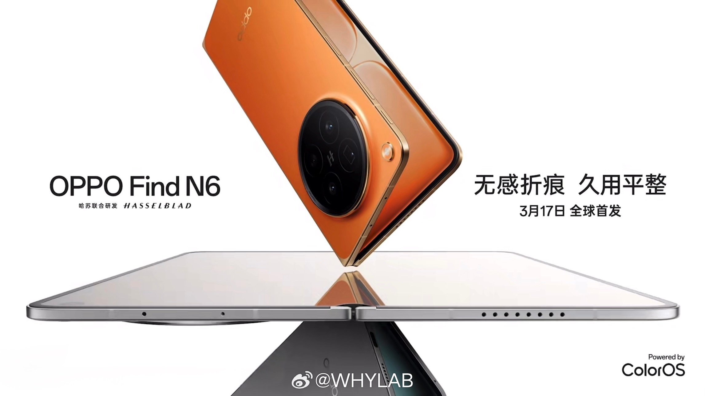 OPPO Find N6 官宣 3 月 17 日发布,这次有金橙、原钛、深黑三款配色,支持 AI 手写笔,哈苏 2 亿四摄,芯片级高分子 3D 打印钛合金天穹铰链,内屏天穹记忆玻璃,正面无感折痕。