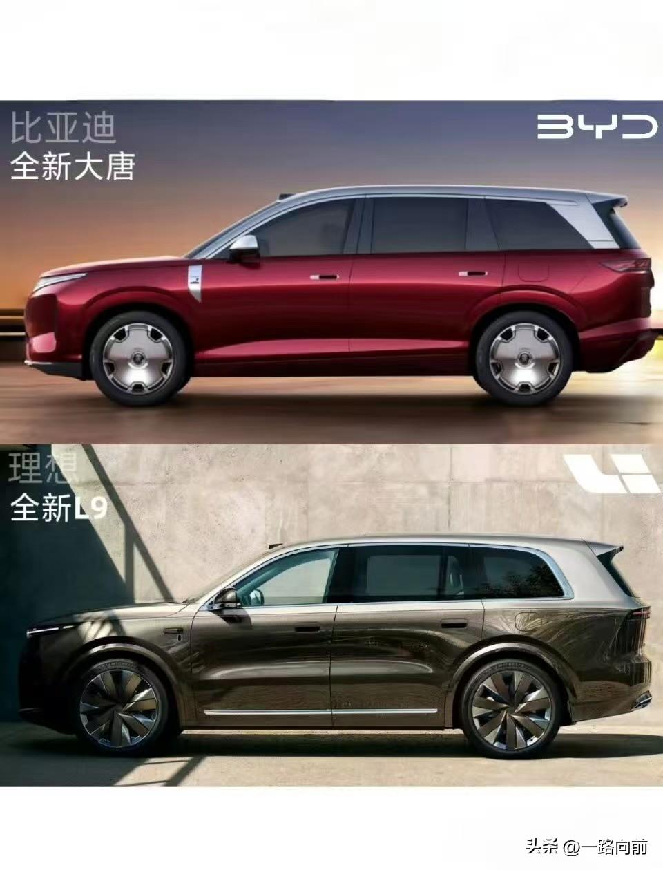比亚迪大唐 pk 理想全新L9,谁更好看? 一个20多万,一个40多万 比亚迪大唐延续龙颜美学,前脸双层贯穿灯带搭配可点亮篆体唐标,分体水晶大灯气场十足,车长超5.3米,线条平直舒展,可选双色车身与大饼轮毂,中式豪华感拉满,尾部贯穿尾灯辨识度拉满,兼顾大气与国风质感。 理想L9走极简科技路线,星环式灯带无雷达开孔,视觉更简洁,车身轮廓方正魁梧,分段腰线增强层次,22寸轮毂搭配隐藏式门把手,整体低调稳重,贴合家庭用户审美,细节处哑光金装饰提升精致度。 参考J.D. Power 2025年SUV外观调研,76%高端用户看重大气质感,63%关注前脸设计。大唐靠国风设计与大尺寸营造旗舰气场,L9以简约线条适配家用场景,风格没有优劣,全看个人喜好。 有人偏爱大唐的中式豪华,有人钟情L9的简约稳重,20万价差下,你更吃哪款的颜值?