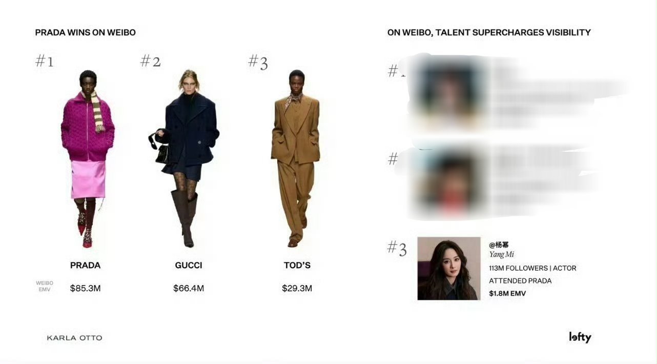Lefty报道,2026米兰时装周 期间,杨幂个人媒体价值EMV高达180万💵,位列微博平台所有艺人【第三】,代言品牌Prada 登顶EMV榜首🎉