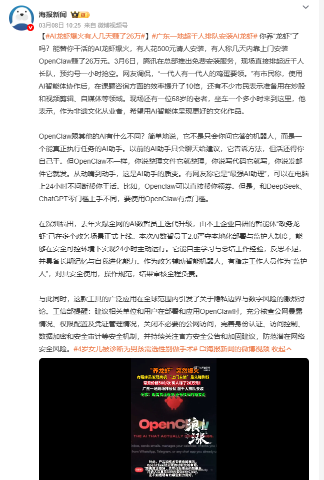 AI龙虾爆火有人几天赚了26万 能干活的AI龙虾火了!OpenClaw从动嘴到动手,堪称最强AI助理,但使用有门槛。深圳“政务龙虾”上线政务场景,可自主学习进化。不过,AI广泛应用引发隐私与数字风险讨论,工信部提醒防范网络安全风险。