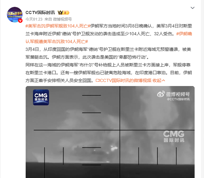 伊朗确认军舰遭美军击沉致104人死亡伊朗确认军舰遭美军击沉致104人死亡 3月4日,从印度回国的伊朗海军“德纳”号护卫舰在斯里兰卡附近海域遭美军潜艇袭击被击沉,造成重大伤亡。同海域“布什尔”号人员被接上岸,另一艘军舰靠泊印度港口,目前伊朗正安排人员回国。