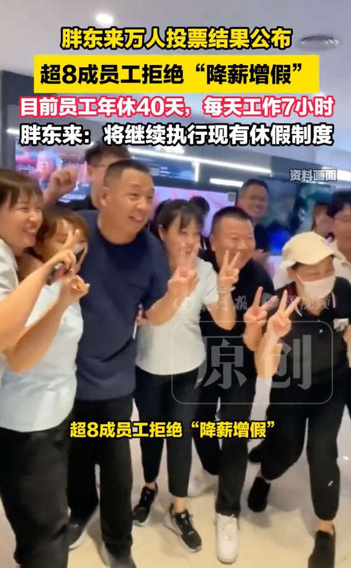 别的公司是想法子让员工多干活,胖东来倒好,主动询问员工:“咱少挣点钱、多放点假行不行?” 这听起来像段子,却是真事。最近胖东来搞了个投票,问大家要不要降薪增假,结果八成员工不愿意,就愿意保持现在每天7小时、一年休40天的节奏。 网友更是直呼良心企业,因为它精准踩中了打工人的两大痛点,假不够休和不敢休息。在不少公司,加班是常态,带薪年假是摆设,甚至很多人觉得按时下班都有罪恶感。胖东来却直接把7小时工作制和40天年假写成制度,还嫌不够,想给员工更多。 更难得的是,它没有自嗨式地为你好,而是把选择权交给员工涨不涨假,你们说了算。这种尊重,比任何口号都实在。员工用投票表态,我们不是不想要假,而是现在这样干得少、休得多、挣得稳的日子,已经足够幸福。 从这也能看出职场人怕的不是忙,而是忙得没价值、累得没尊严。胖东来能成为“口碑神话”,无非是做到了最基本的一条,把员工当人,而不是工具。