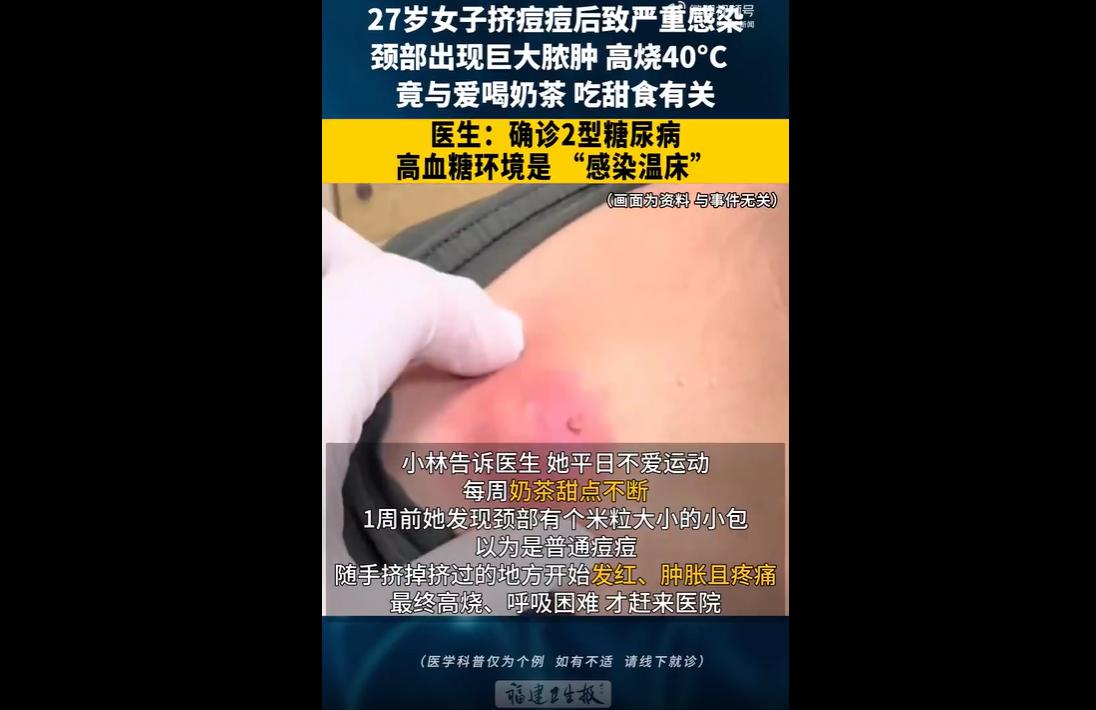 27 岁女子小林长期久坐、不爱运动、频繁喝奶茶吃甜食,身体发胖却未重视。 一周前挤颈部小痘后引发严重感染,颈部形成巨大脓肿,高烧 40℃就医,被确诊严重皮肤软组织感染合并 2 型糖尿病,险些引发败血症。 医生提醒,高糖饮食是致病主因,高血糖会大幅降低人体免疫力。 事件中的女孩,是无数在大城市独自打拼的年轻人缩影:长期加班、久坐不动、缺乏锻炼,把奶茶、蛋糕、甜食当作缓解压力的慰藉,一天两三杯、每周三四次已成常态。 甜饮入口的快乐是短暂的,可过量糖分带来的伤害却是持久而致命的。 过量糖分疯狂冲击本就脆弱的胰岛,让代谢系统不堪重负,最终在毫无征兆的情况下,诱发 2 型糖尿病。 很多年轻人总觉得,糖尿病是中老年病,与自己无关。 可现实是,糖尿病正以惊人速度年轻化。长期高糖饮食、熬夜、缺乏运动、肥胖超重,都是最危险的导火索。 等到口干、多饮、多尿等典型症状出现时,身体早已受损,而当事人却常常视而不见,继续放纵。 比糖尿病更可怕的是,高血糖像一颗定时炸弹,悄悄瓦解人体免疫力。 血糖居高不下,免疫细胞杀菌能力大幅下降,一个微不足道的小伤口、一颗被挤破的痘痘,都可能成为细菌疯狂繁殖的温床,迅速发展成大面积感染、脓肿,甚至引发败血症、感染性休克,直接威胁生命。 一颗小痘引发重症,不是夸张,而是高血糖埋下的必然恶果。 医生的警告振聋发聩:管住嘴、迈开腿、少喝奶茶、少吃甜食、定期体检,不是口号,而是保命的底线。 年轻人必须清醒,糖尿病可防可控,但一旦患上便是终身相伴;小伤口可轻可重,但在高血糖环境下足以致命。 别等病痛找上门才追悔莫及,别等身体垮掉才懂得珍惜。