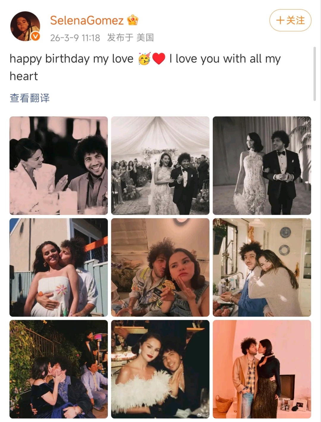 大头丈夫生日🎂,赛琳娜·戈麦斯晒出结婚照表达爱意“happybirthday