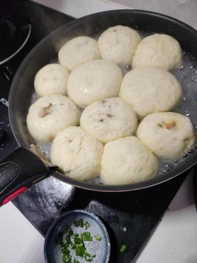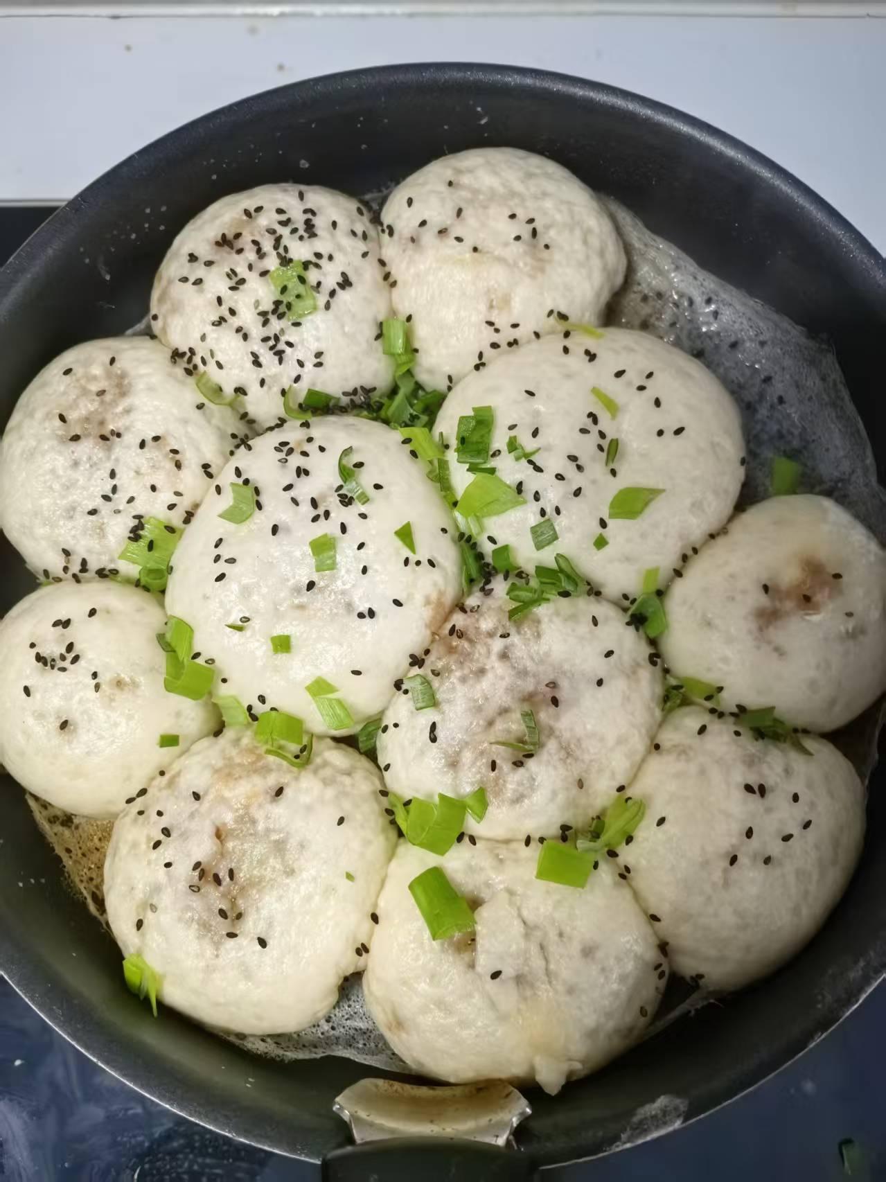 今日午餐 又香又省工的水煎包和杂烩菜 水煎包的制作: 先把面团和好醒半小时,然后把发好的面分为小剂子,撖成圆饼包上肉馅,撒上黑芝麻。 锅中加适量食用油上锅煎制,为防止烤焦底部,用小喷壶随时向锅周边喷适量水,这样做出的煎包,含油少且包子十分香。 杂烩菜的制作: 在炒好葱姜末的基础上,加适量水烧开,再加入肉馅丸子、蘑菇、肉片、粉条、青菜等一起饨,最后根据想要口吻,加入各种调料调味,顿成杂烩菜。 这种吃法即味美又省事。友友们评论一下吧!