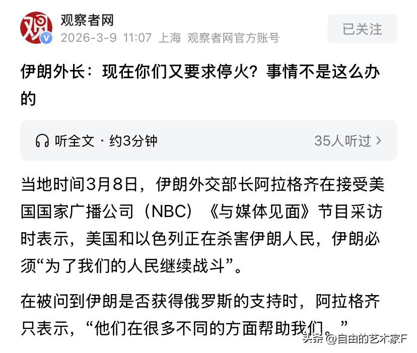特朗普喊话“停火”后,伊朗回应了:你说了不算 3月8日凌晨,以色列袭击了伊朗的石油设施。此举在叠加中东主要产油国的产量大幅度减产之后,石油价格一夜涨幅扩大至25%,每桶价格高达118美元。 特朗普的两个盟友国,日韩国再一次遭受到了冲击,日本股市暴跌,韩国股市触发了熔断机制。 特朗普在开战之后,首次提起了对伊朗的停战,他指出停战需要考虑以色列的意见,两国会进行沟通,在需要的时候他会做出决定。 在特朗普喊话停火之后,伊朗外交部长阿拉格齐在接受NBC采访的时候,对特朗普喊话停火的问题做出了回应:称事实摆在所有人的面前,美国和以色列正在杀害伊朗人,杀害女学生还轰炸伊朗的医院。造成了多名无辜的伊朗人死亡。 美国和以色列破坏了去年的停火协议,并且又在今年的时候谈判期间轰炸了伊朗,现在又要求停火,事情不是这么办的?美国和以色列必须付出代价。停火不是由美国和以色列说了算,而是由伊朗人说了算。 对于伊朗人的回应,我们是怎么看的?伊朗之所以选出哈梅内伊之子担任最高领袖,已经说明了伊朗各方势力已经达成一致,和继续对抗美国以及以色列的决心,所以,在目前的这种情况下,伊朗不会轻易地同美国人进行任何的谈判和缓和局势的行动,这意味着残酷的战争将继续地拉开帷幕