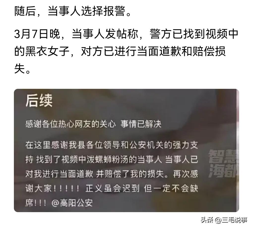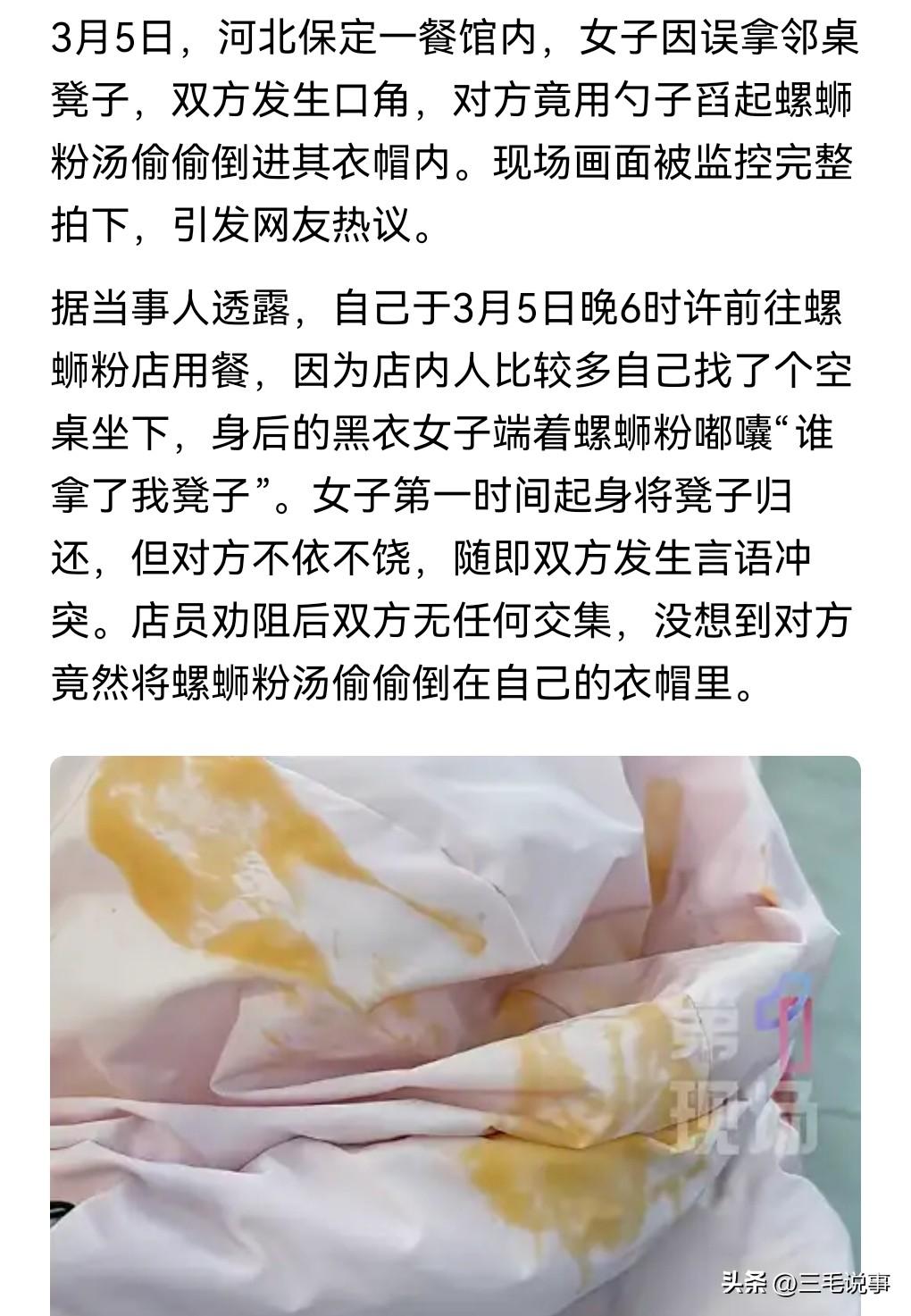 好消息,好消息,真是天大的好消息啊。 那个缺德的女人终于害怕了。 近日,一名女子出于泄愤,竟然把螺丝汤粉用勺子倒在邻桌一个女人衣服的衣帽上。 这就是典型的太缺德了。 女子选择报警。此事也在网上发酵。 3月9日我在网上看到一则消息,泼螺蛳粉汤的女子已道歉赔偿。 那肯定是要道歉赔偿的,不然的话就让这女人去坐牢。 所以这必须道歉赔偿。