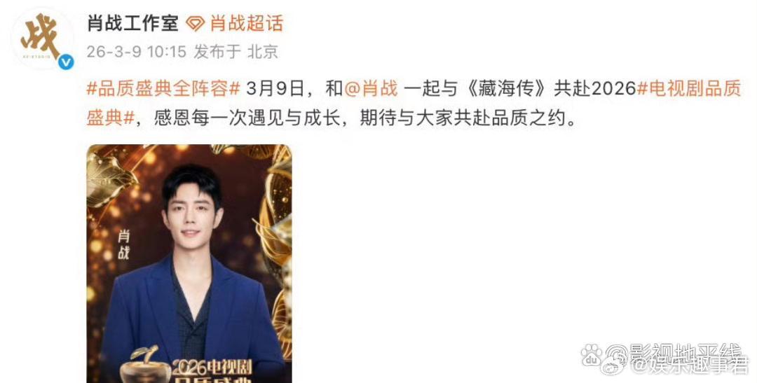 今日,演员肖战携《藏海传》正式官宣加盟2026电视剧品质盛典!一起期待肖战的盛典亮相。