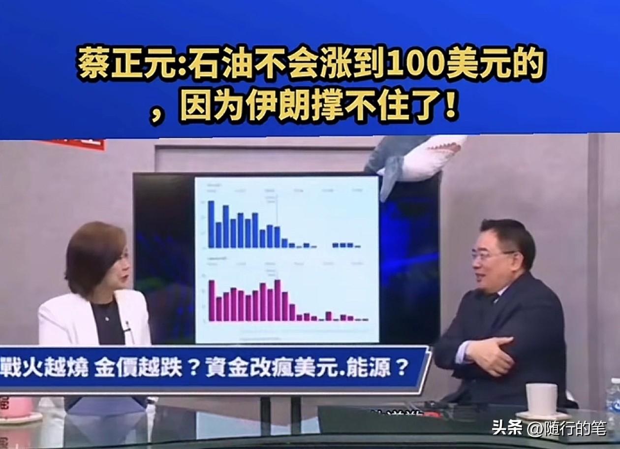尴尬了,蔡正元在美以袭击伊朗这件事情上的判断,说多错多。 蔡正元对伊朗是没有什么好感的,并且一开始也不认为伊朗能够撑多久,觉得伊朗很快就会垮掉。所以蔡正元近期不断在各政论节目中吹嘘自己的判断,没想到的是因为低估了伊朗的坚韧,导致了在他擅长的金融领域也翻车了。日前在平秀琳的节目中,蔡正元信誓旦旦的判断石油不会涨到100美元,蔡正元的根据就是源于他对伊朗的误判,对美国和以色列的高估。至于蔡正元有这种认知,一是基于他长久以来对美国军事实力太过相信,误把表面军事数据对比当做客观事实,第二也是受了此前委内瑞拉总统马杜罗轻松被美国抓捕的影响,以为伊朗像委内瑞拉那样轻松被美国击垮。所以,蔡正元每次谈到美以对伊朗的打击,都一副莫名自信的模样。但是,现在看来蔡正元被事实数据打脸了,到了今天3月9日,油价已经涨到超过100美元了,并且还没看到要下跌的趋势。蔡正元这判断可以说完全与事实背离了,被数据狠狠的打脸了他的自以为是。