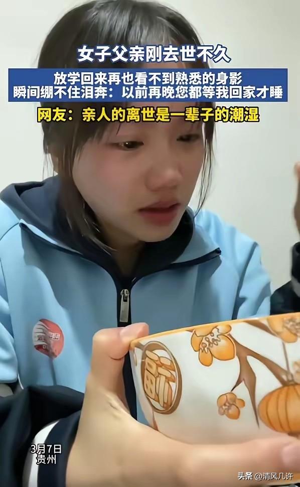 看破防了!贵州,一名放学回来的女孩,正吃着饭,眼泪却像断了线的珠子一样往下砸,网友直呼:这种无声的痛,只有经历过的人才懂。 女孩端着印着福字和柿子图案的碗,筷子悬在半空,嘴里的饭菜还没来得及咀嚼,泪水就接连砸在碗沿,晕开小小的湿痕。 她没有放声哭喊,只是肩膀不停抽动,每一次吸气都带着克制不住的哽咽,端碗的手也跟着轻轻晃动,连带着碗里的饭菜都微微震荡。 女孩的父亲离世不过数日,这个家还没从丧亲的沉重里缓过来,她放学推门的那一刻,就被扑面而来的空落裹住。 以往这个时刻,玄关的鞋柜旁总会摆着父亲的旧布鞋,客厅的暖光灯一定会亮着,哪怕凌晨才放学,她也能看到父亲坐在沙发上的身影。要么是翻着折了角的报纸,要么是盯着重播的戏曲节目,只要听见她推门的声响,父亲就会立刻抬头,笑着喊她赶紧洗手吃饭。 家人把盛好的饭递到她手里时,她闻到了熟悉的味道,那是父亲生前最常做的土豆烧牛肉。 就是这股刻在记忆里的香气,瞬间击溃了她所有的伪装。她想起三天前放学,突降的暴雨打湿了她的校服,她抱着书包跑到单元楼下,就看见父亲倚着门框站着,手里攥着她的厚卫衣,头发和肩膀都被雨水打湿,却还先问她有没有淋到。 她试着把筷子伸进碗里,夹起一块牛肉往嘴里送,却怎么也咽不下去。 从前吃饭,父亲总坐在她对面,不停往她碗里夹菜,嘴里反复念叨着“正是长身体的时候,多吃点”,还会追着问她学校里的事,听她讲课堂上的趣事,跟着她一起笑出声。如今餐桌旁的那个位置空了,那些细碎的叮嘱、爽朗的笑声,也跟着父亲一起,永远留在了过去。 她下意识抬头望向客厅的沙发,那个父亲坐了十几年的位置,此刻只放着一个叠好的靠垫。 茶几上再也没有父亲泡好的菊花茶,电视柜旁的烟灰缸,也被家人收了起来,只留下一道浅浅的印记。她突然记起,父亲离世前一天,拉着她的手反复叮嘱,让她一定要把钥匙挂在书包侧袋,说以后要是他没在楼下等,别让自己在门口冻着。那时候她还嫌父亲啰嗦,皱着眉点头应付,如今再想起,每一个字都像针一样扎在心上。 身边的家人默默递过一张纸巾,没有说任何安慰的话。 他们都清楚,这种失去至亲的痛楚,不是几句“别难过”就能抹平的。女孩接过纸巾,胡乱擦了擦脸上的泪水,可新的眼泪还是顺着脸颊往下淌。她终于放下碗筷,将脸埋在餐桌上,压抑了许久的啜泣声,终于断断续续地传了出来。 这段视频被发布后,迅速引发了无数网友的共情。有网友留言,亲人的离世从来不是一场突如其来的暴雨,而是漫延一生的潮湿。 女孩的模样,让太多人想起了自己失去至亲的瞬间,那些曾经被视作理所当然的陪伴,在失去之后,才明白是最珍贵的馈赠。父亲的等待,从来都不是一种习惯,而是他用自己的方式,守护着女儿的每一段归途。 我们总在忙碌中忽略身边的人,总觉得来日方长,总以为还有无数个明天可以陪伴父母。 却忘了生命本就充满未知,那些看似平淡的日常,那些深夜里的守候,那些饭桌上的叮嘱,都是亲人藏在岁月里最深沉的爱。就像这个女孩的父亲,他没有惊天动地的壮举,却用无数个“再晚都等你”的夜晚,把爱揉进了女儿的生命里。 女孩还在上学,人生的路还有很长。父亲的离开,会成为她心底永远的牵挂,也会化作她前行的力量。父亲教给她的善良与勇敢,藏在陪伴里的温暖与爱意,会一直陪着她,走过往后的每一次风雨,看过沿途的每一处风景。 亲人的离去从不是真正的告别,那些刻在骨子里的爱与牵挂,会以另一种方式,永远陪在我们身边,在我们迷茫时给予方向,在我们脆弱时给予勇气。我们能做的,就是带着这份爱,好好生活,好好长大,让远在天堂的亲人,能安心地看着我们走向更远的地方。 各位读者你们怎么看?欢迎在评论区讨论。
