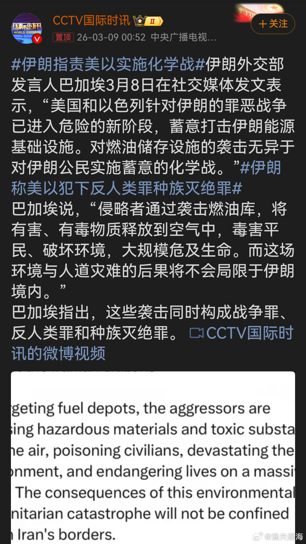 伊朗指责美以实施化学战美以的行径令人发指!公然袭击伊朗燃油储存设施,释放有害物毒害平民、破坏环境,这是对国际准则的肆意践踏。其行为已构成战争罪等严重罪行,是对人道的漠视。国际社会应予以强烈谴责,让美以对自己的恶行付出应有的代价。