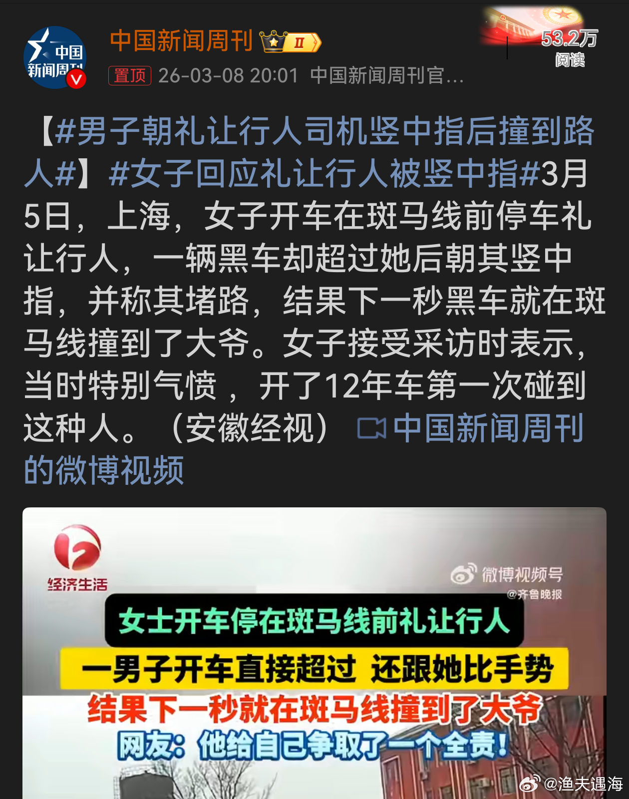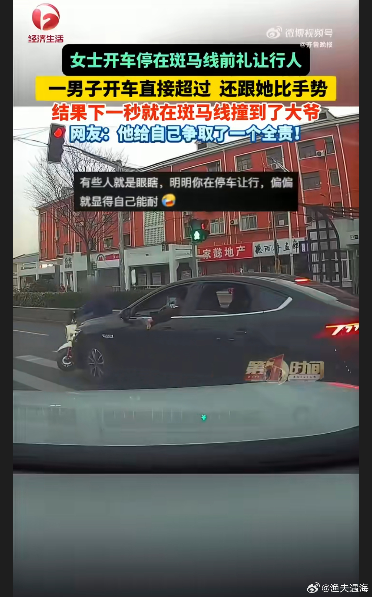 男子朝礼让行人司机竖中指后撞到路人这种行为实在令人不齿!黑车司机不仅对礼让行人的善举毫无敬意,还竖中指挑衅,尽显素质低下。而其随后撞到路人,可谓是自作自受。遵守交规、尊重他人是基本的驾驶素养,该司机应为此深刻反思。