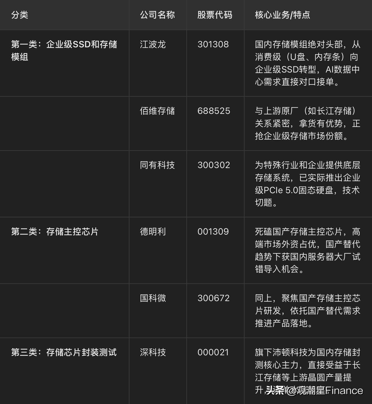 中国存储厂商长江存储(YMTC)发布其首款商用 PCIe 5.0 SSD——PC550。 顺序读取速度 最高 10,500 MB/s。 潜在受益方向: 1、存储产业链 NAND Flash、企业级SSD厂商需求持续提升 2、AI算力基础设施 数据中心服务器、AI存储系统需求增长 直接点几个在产业链上真正干活的核心公司: 第一类:做企业级SSD和存储模组的 长江存储主要是造里面的闪存颗粒(NAND),但最后做成能插在服务器上的成套硬盘,还得靠这些下游的模组厂。 • 江波龙(301308):国内存储模组的绝对头部。以前靠卖消费级U盘、内存条起家,这两年拼了老命在往企业级SSD转型。AI数据中心需求一起来,它算是最直接对口的接单选手。 • 佰维存储(688525):跟江波龙逻辑类似,这家公司跟国内的上游原厂(比如长存)关系很铁,拿货有优势。现在也在拼命抢企业级存储的市场份额。 • 同有科技(300302):这家路子不太一样,主要是给特殊行业和企业做底层存储系统的。而且他们家已经实际推出了企业级的PCIe 5.0固态硬盘,属于非常切题的标的。 第二类:搞存储主控芯片的 硬盘光有颗粒不行,还得有个“脑子”来指挥数据怎么存、怎么读,这就是主控芯片。到了PCIe 5.0这个级别,对读写延迟和稳定性的要求极高,主控的技术门槛就成了硬骨头。 • 德明利(001309) 和 国科微(300672):这两家都在死磕国产存储主控芯片。虽然目前高端主控市场还是外资占大头,但在国产替代的大趋势下,只要产品能跑通,国内的服务器大厂都会愿意给他们试错和导入的机会。 第三类:给存储芯片做封装测试的 上游原厂把晶圆造出来后,得切开、封装好才能用,这个环节赚的是加工费,直接吃产能红利。 • 深科技(000021):它旗下的沛顿科技,是国内存储封测的核心主力。逻辑非常简单粗暴:只要长江存储这些上游大哥的晶圆产量提上去了,它这边的封测订单就跟着水涨船高。