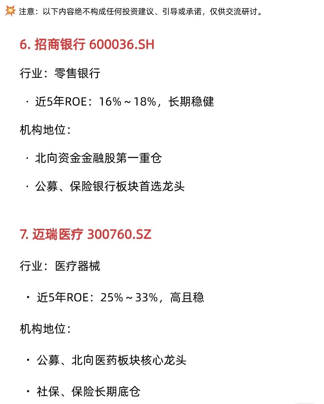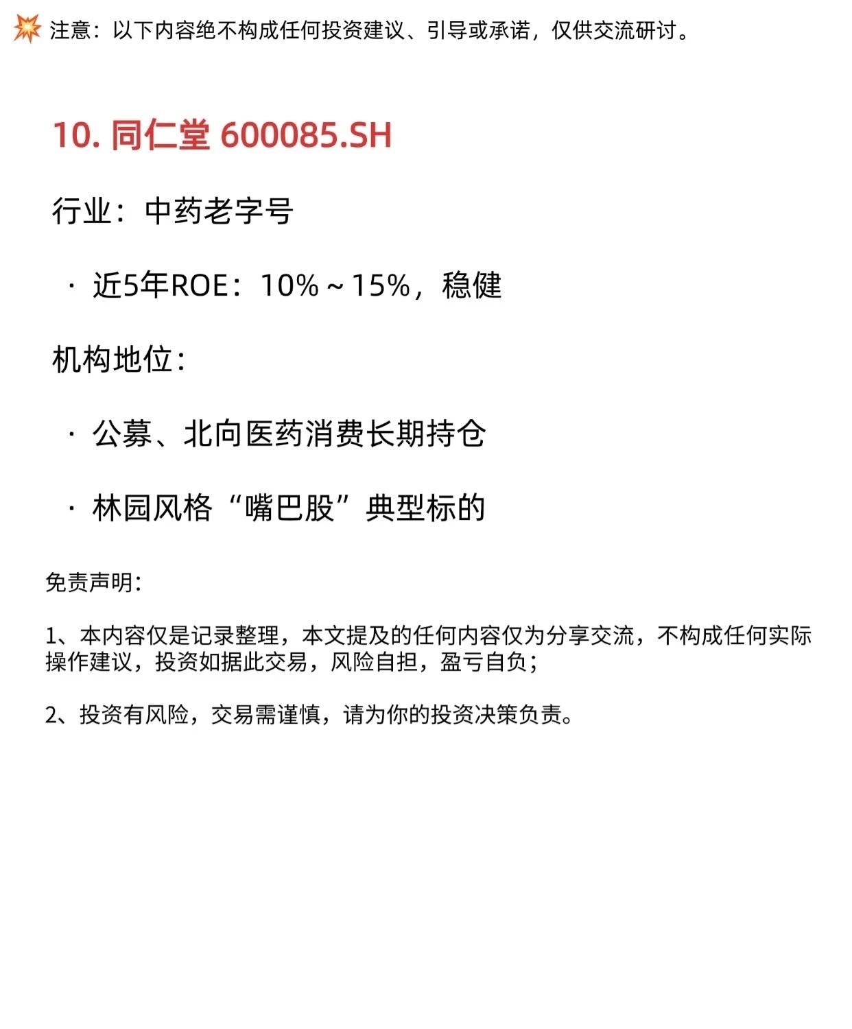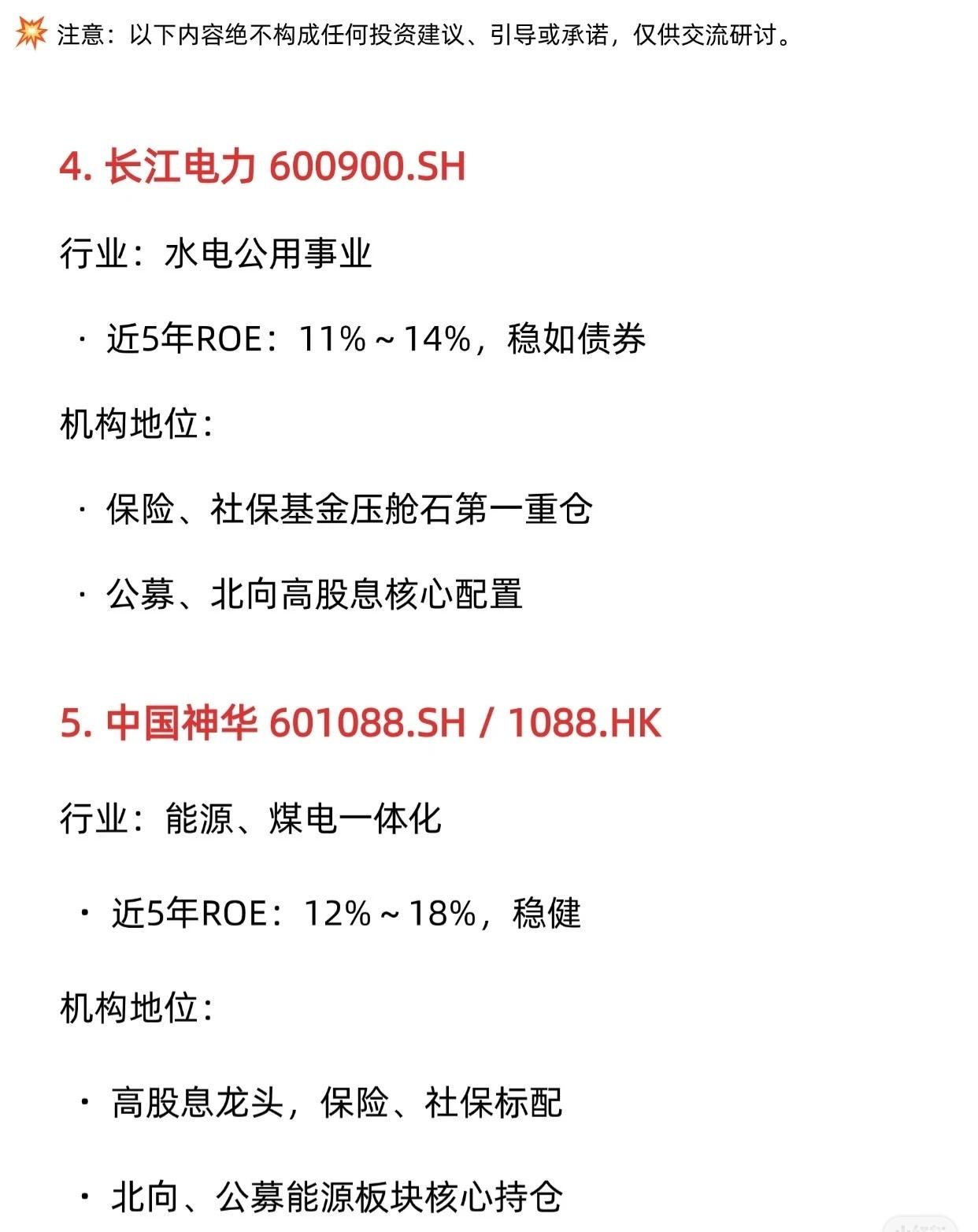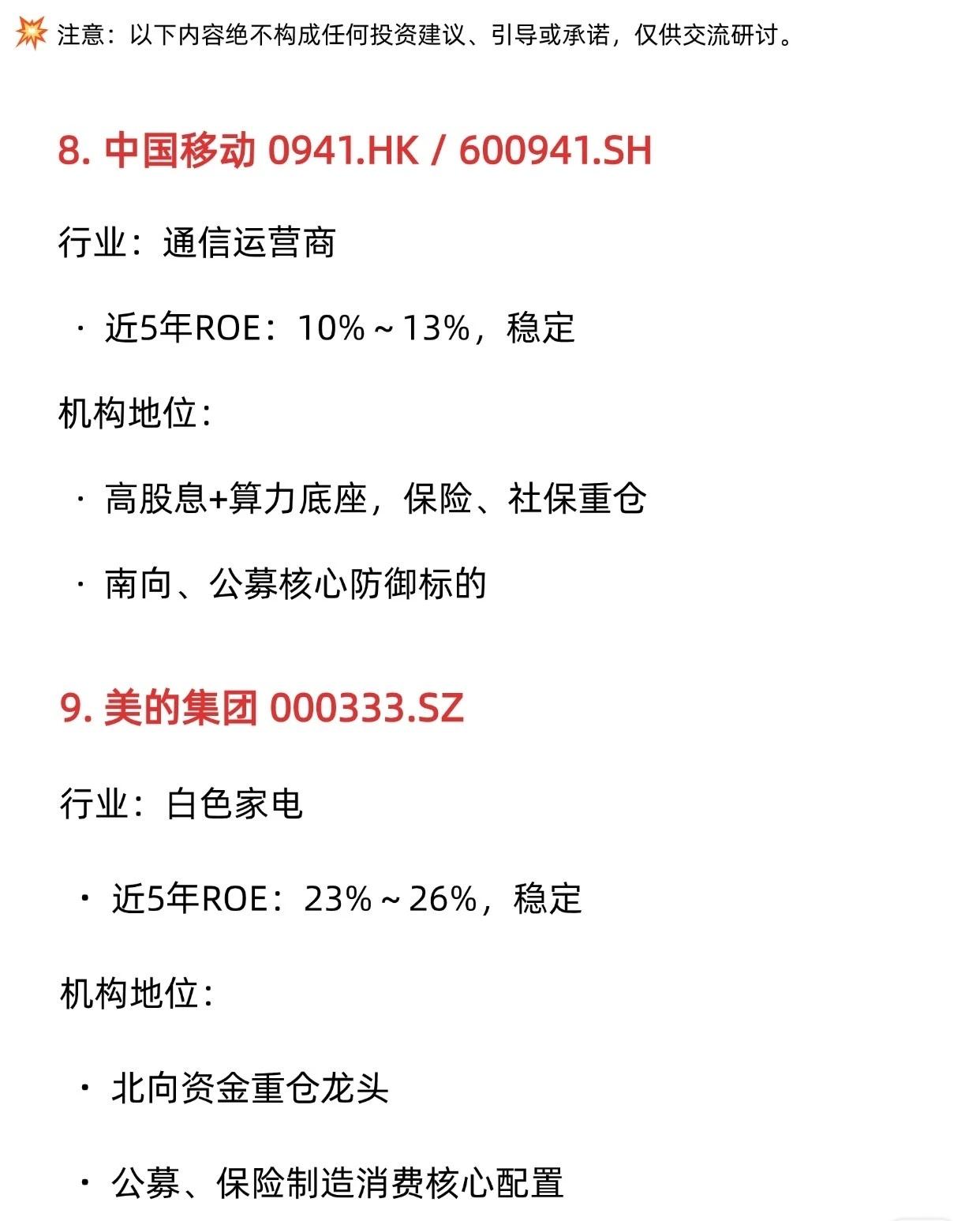 这是一份关于A股机构价值投资重仓前十强的梳理报告。这些股票的共同特点是近5年ROE(净资产收益率)高且稳定,并被各类机构投资者(如保险、社保、公募、北向资金)作为核心底仓配置。 以下是这十家公司的核心特点总结: 1. 贵州茅台 (600519.SH) * 行业:白酒 * ROE:30%~36%,极稳 * 地位:消费板块绝对龙头,北向、公募第一大重仓,社保核心底仓。 4. 长江电力 (600900.SH) * 行业:水电公用事业 * ROE:11%~14%,稳如债券 * 地位:高股息核心配置,保险、社保基金压舱石第一重仓。 5. 中国神华 (601088.SH / 1088.HK) * 行业:能源、煤电一体化 * ROE:12%~18%,稳健 * 地位:高股息龙头,保险、社保标配,北向、公募能源板块核心持仓。 6. 招商银行 (600036.SH) * 行业:零售银行 * ROE:16%~18%,长期稳健 * 地位:北向资金金融股第一重仓,公募、保险银行板块首选龙头。 7. 迈瑞医疗 (300760.SZ) * 行业:医疗器械 * ROE:25%~33%,高且稳 * 地位:医药板块核心龙头,社保、保险长期底仓。 8. 中国移动 (0941.HK / 600941.SH) * 行业:通信运营商 * ROE:10%~13%,稳定 * 地位:高股息+算力底座,保险、社保重仓,南向、公募核心防御标的。 9. 美的集团 (000333.SZ) * 行业:白色家电 * ROE:23%~26%,稳定 * 地位:北向资金重仓龙头,公募、保险制造消费核心配置。 10. 同仁堂 (600085.SH) * 行业:中药老字号 * ROE:10%~15%,稳健 * 地位:医药消费长期持仓,林园风格“嘴巴股”典型标的。 免责声明:以上内容仅为记录整理,不构成任何投资建议、引导或承诺,投资有风险,交易需谨慎。