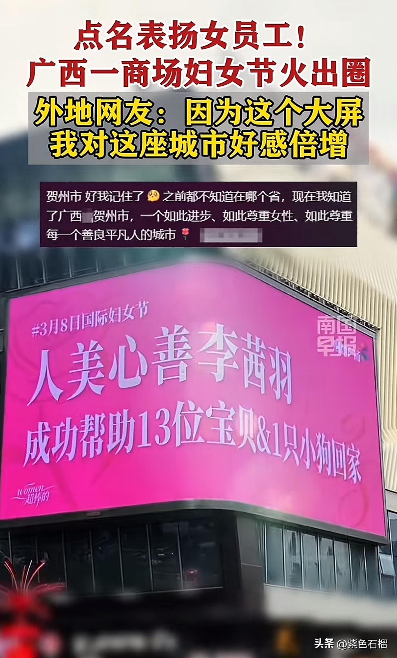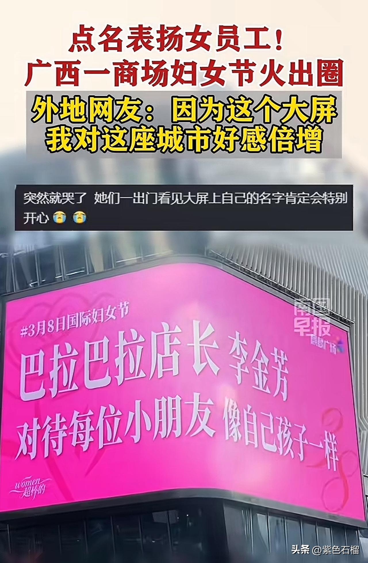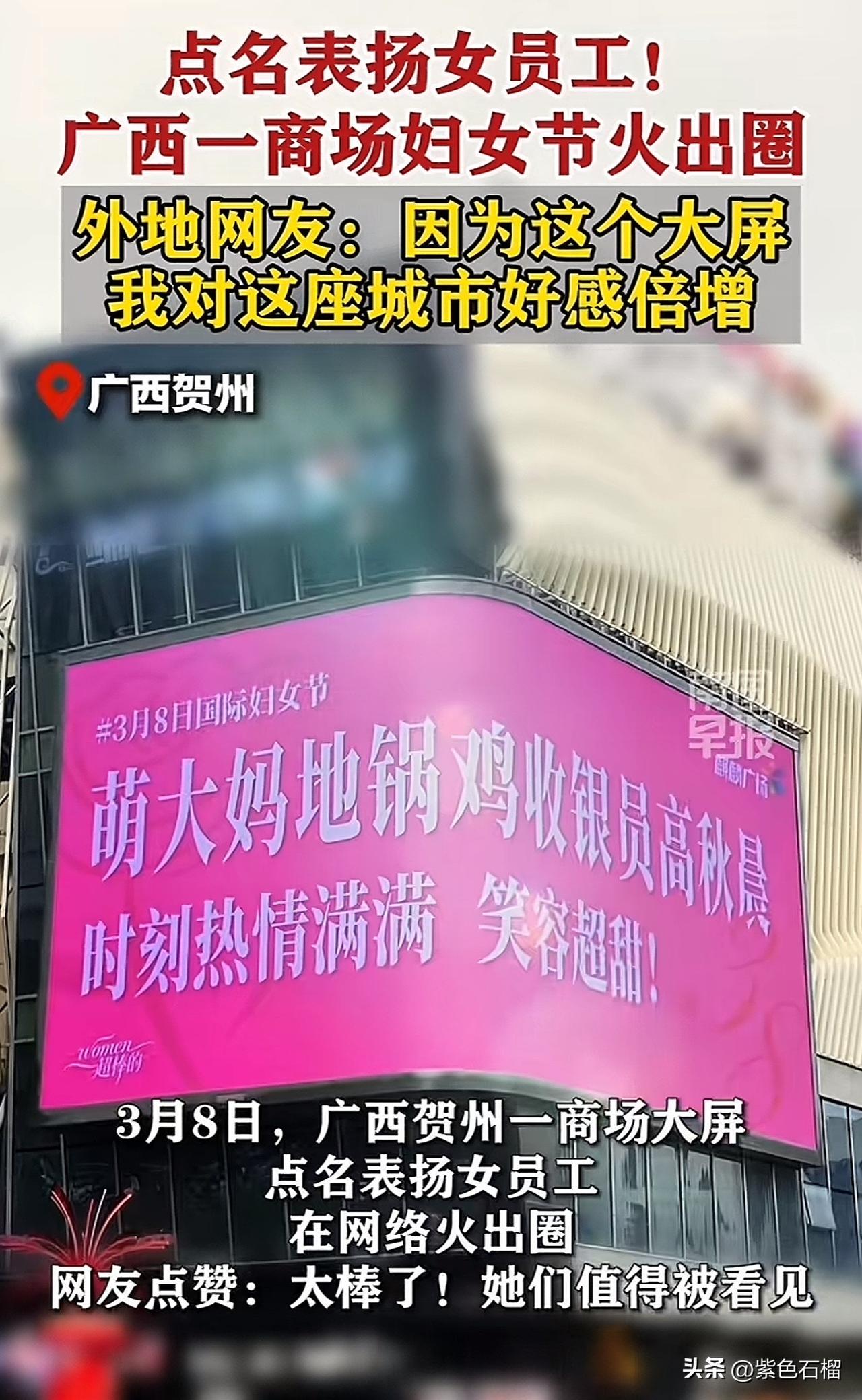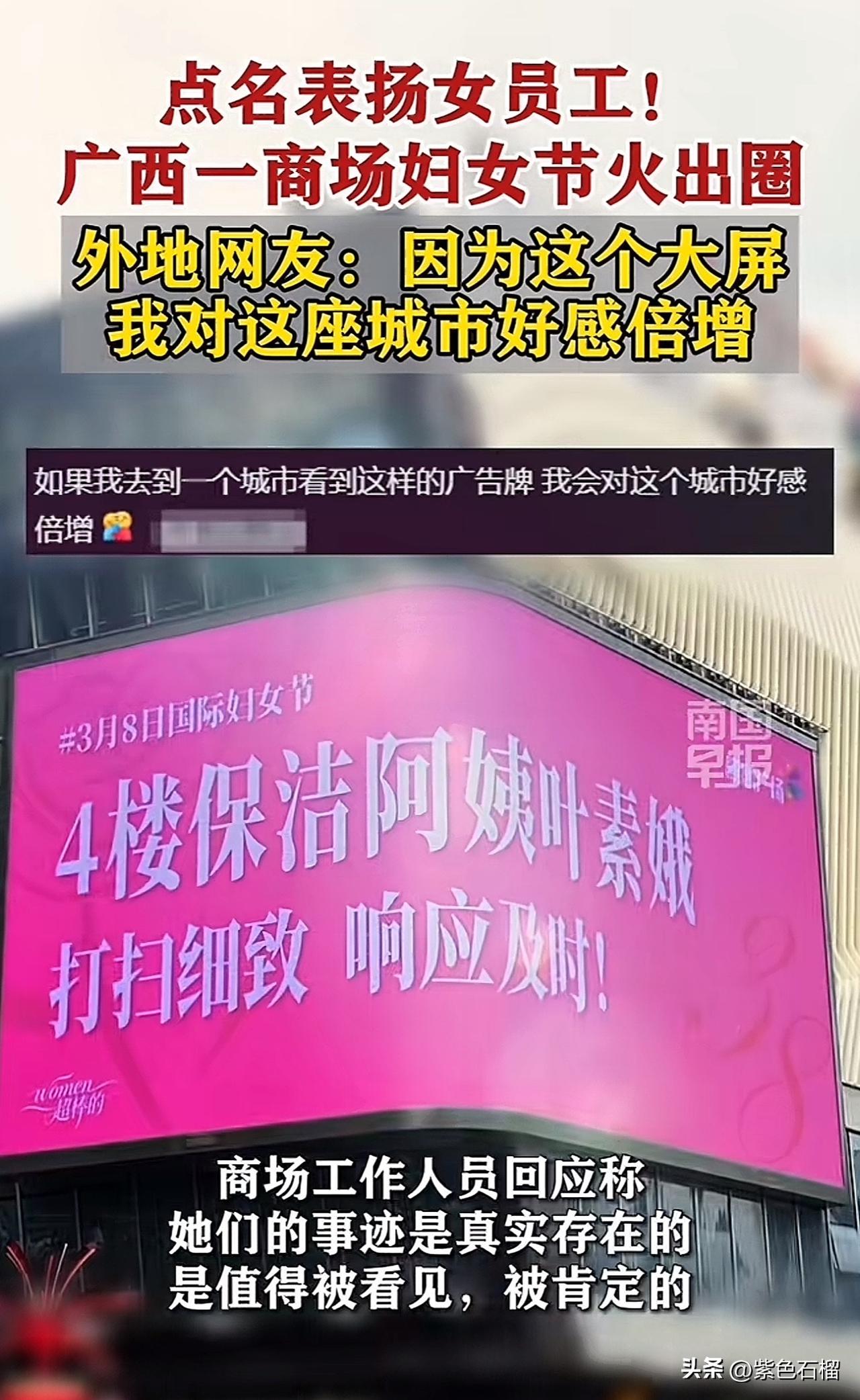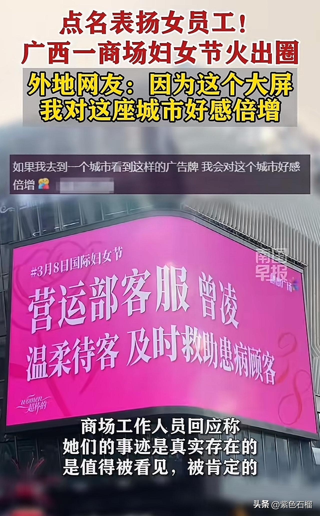 这几日,广西一家商场的大屏成功火出圈。 原来,在三八妇女节来临之际,商场在大屏幕上循环展示女职工的名字及其事迹,赢得网友纷纷点赞。 看看被商场大屏幕“点名”的事迹都有啥: 地锅鸡收银员工作热情高涨,笑容格外甜美! 客服温柔待客,及时帮助患病顾客。 保洁阿姨打扫细致入微,响应迅速…… 虽说都是些点滴小事,但被放在大屏幕上表扬的员工,心里想必比得到任何物质奖励都要甜。 对此,商场工作人员回应称:这些事迹都是真实存在的,值得被看见、被肯定! 个人觉得,商场这种形式的表扬,着实是在宣扬正能量,能让每一位员工的努力都被看见。 有网友表示:因为这块大屏,我对这座城市的好感直线上升。 对于商场在妇女节采用这样的点名表扬形式,大家怎么看?欢迎在评论区交流。 (图片来源网络)