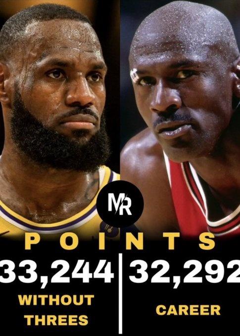 乔丹、詹姆斯总得分分布: 乔丹:32292分 三分球——1743分 两分球——23222分 罚球——7327分 詹姆斯:43127分 三分球——7866分 两分球——26440分 罚球——8821分 时代带来的差异,让詹姆斯出手了更多的三分球。 事实上,在詹姆斯生涯的前10年里,他的三分出手并不算多,一直处于联盟中等偏下的位置。他骨子里还是上一代人打球的方式,球球冲篮下找对抗,自己并不注重三分球。 乔丹生涯单赛季最多进了111个三分球,詹姆斯头10年单赛季最多也就132个三分,考虑到两人位置的不同,事实上就是处于同一水平线上。 但如今时代不同了,詹姆斯作为肌肉型的锋线,也需要大量的三分出手。乔丹如果身处这个时代,只会投的更多,且按照他的投篮手感,三分球练出稳定的40%以上命中率,几乎没有什么悬念。 乔丹曾经说过,自己不喜欢三分球,在三分线外接球投篮,会让自己感觉是被比赛支配,等待施舍,而不是主动掌控赛场。 但如果乔丹感受一下近10年的比赛变化,估计也要改一改想法了。