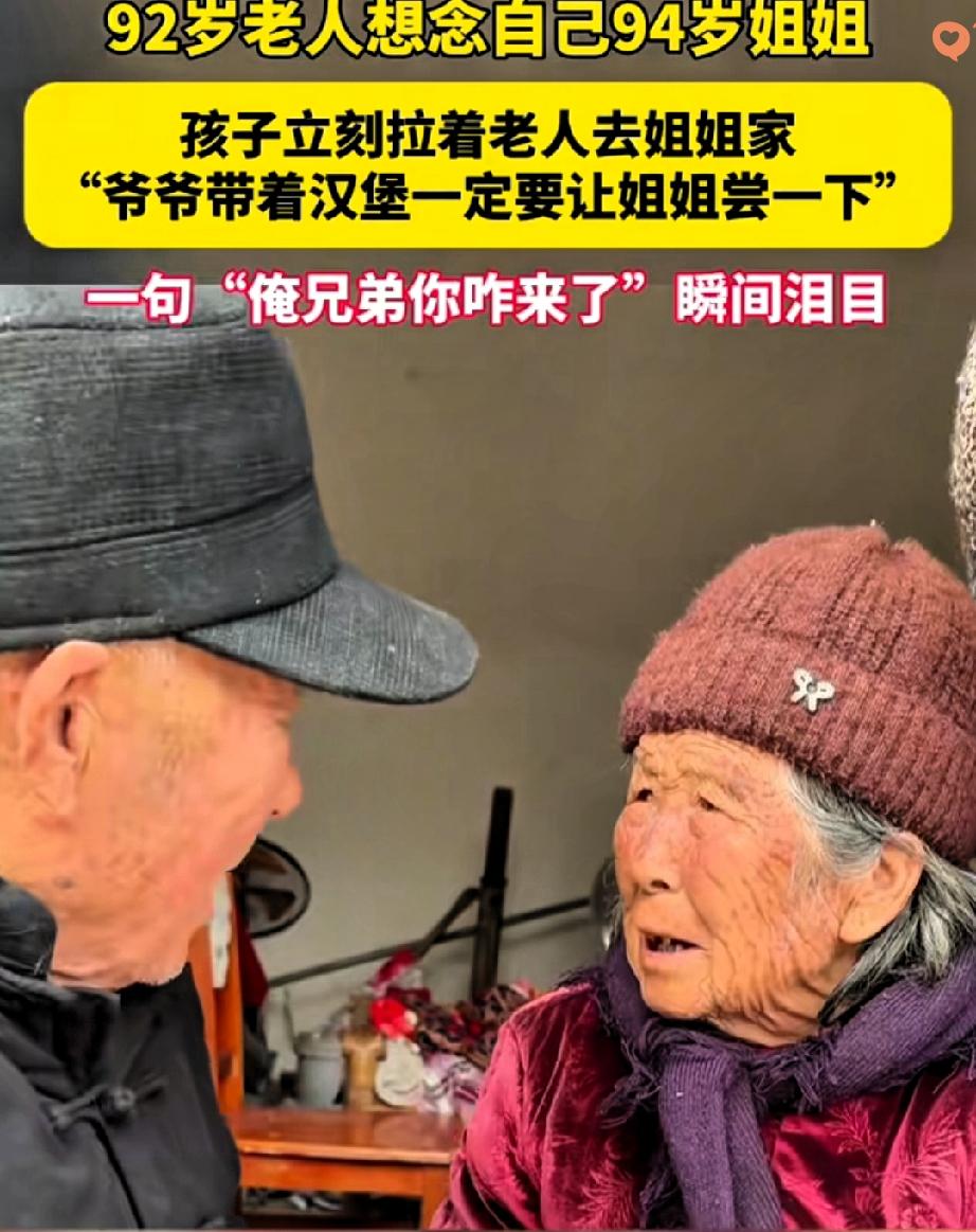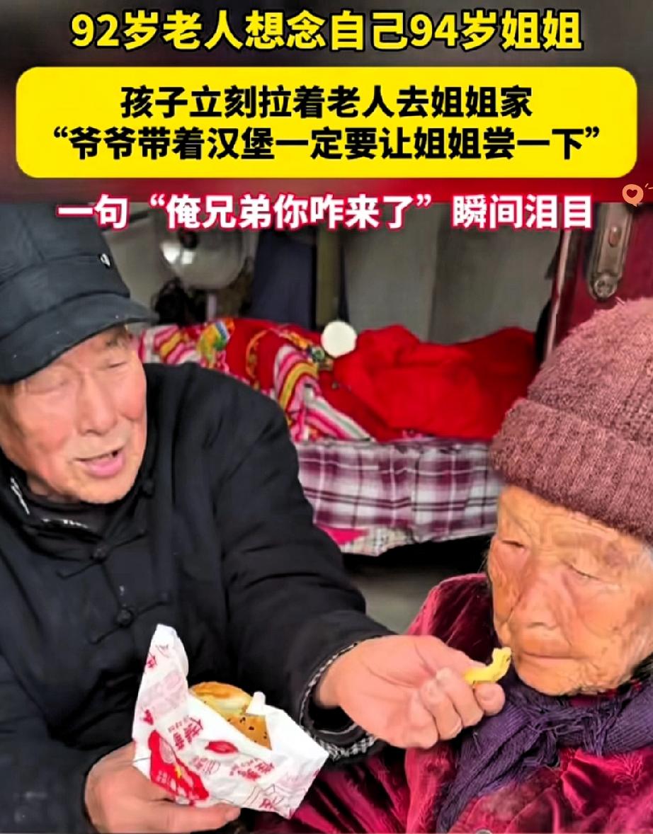 92岁老人吃一口汉堡就红了眼,非要掏钱再买一份,原来心里记挂着94岁的姐姐还没尝过这新鲜玩意儿。 这对加起来快两百岁的姐弟,不过一小时车程,却因为年事已高多年未见。 老人特意刮了胡子换了干净衣服,一路上攥着温热的汉堡,眼含热泪念叨着“马上能见到我姐了”。 见到姐姐的那一刻,他老远喊出声,姐姐看不清却凭着声音本能追问,一句“俺兄弟你咋来了”,让俩老人瞬间泪崩。 手紧紧攥在一起的模样,比任何情话都动人。 其实亲情最动人的从来不是惊天动地的付出,而是岁月磨不掉的惦记——哪怕忘了世间许多事,也忘不了要把好吃的留给最亲的人。 父母不在后,兄弟姐妹就是我们在这人世间最亲的根,是归途上彼此取暖的伴儿。 你多久没见家里的兄弟姐妹了?现在最想跟他们说句啥?
