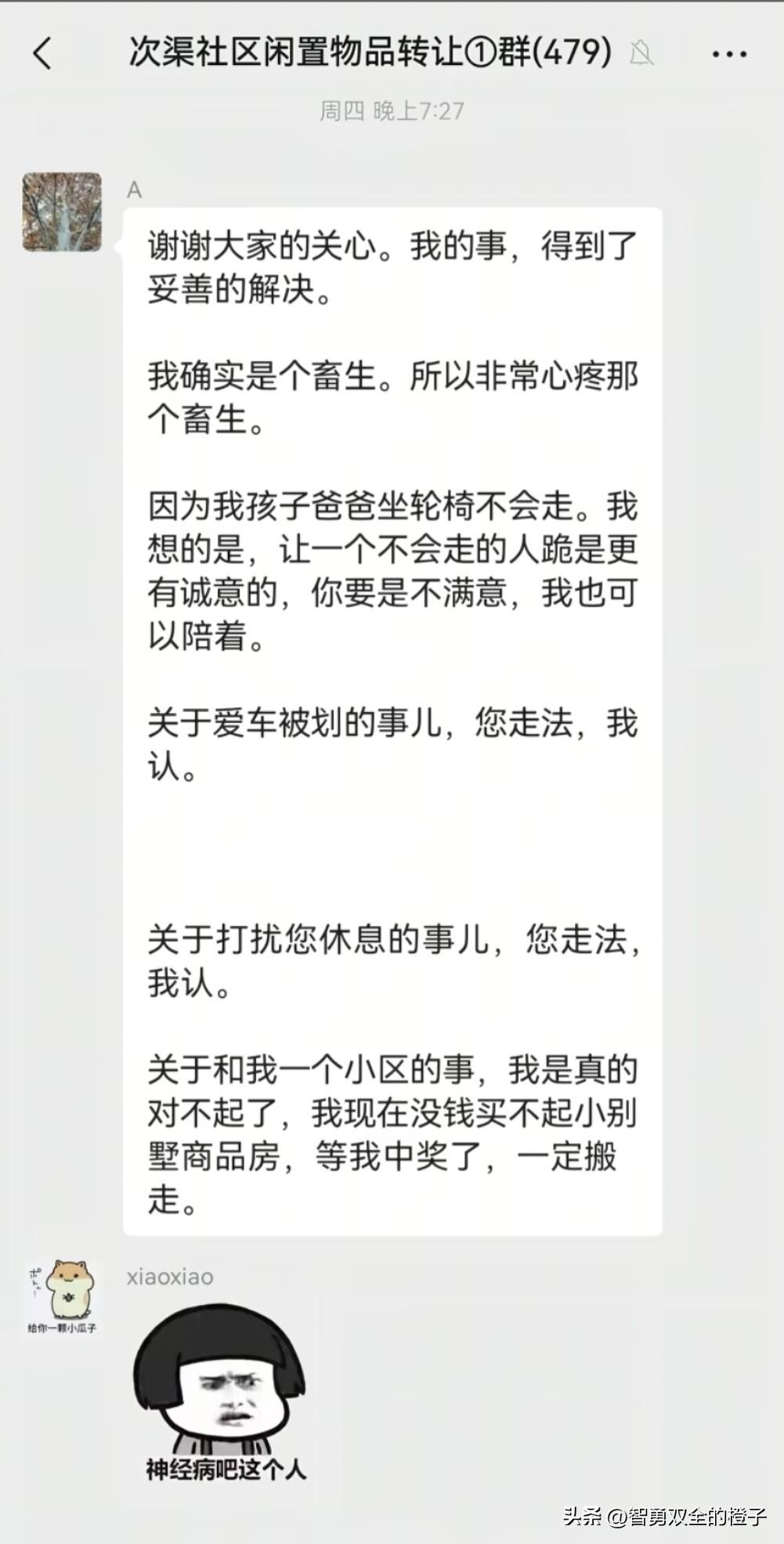 笑不活了!北京某小区,一大姐养了6年的大公鸡被人打死在停车场入口,大姐为了找到是谁干的,每天拿着大喇叭在小区内喊:是谁杀了我的大公鸡,警察正在找你。 不仅如此,大姐还在小区群里说,一只鸡才几年寿命,你就算对鸡不满,也可以直接找她,不应该对一只鸡下毒手,她可以赔礼道歉,也可以让她老公(残疾人坐轮椅)下跪道歉。 据知情的业主说,这只大公鸡平时散养在小区内,有时还能在电梯没碰到,给它按电梯会自己回家,可能是有人受不了它打鸣,听说还有业主的车被划。 现在整个小区的人都要抓狂了,这位大姐不管白天黑夜,都在小区内拿着大喇叭到处喊,简直比大公鸡打鸣还吵。 既然在小区内散养了6年,其它业主应该习惯了吧,有没有可能是在停车场,不小心撞到的,真心疼这个小区的业主。 大家怎么看呢?