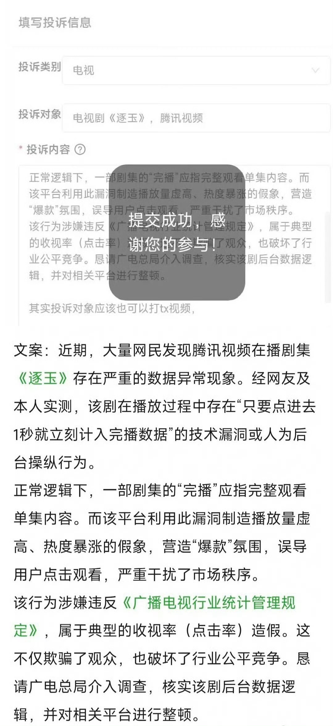 网友举报逐玉收视率造假