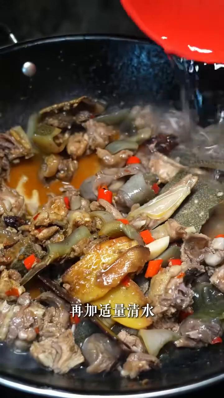 霸王别鸡。 在湖北农村基本上都会收地笼,特别是下雨就容易心情激动。"鞑一高"这屋后的水沟池塘往往藏着很多惊喜。看看今天老张的收获,看来今天还不错。然后去随机抓只3年老母鸡来组成今日的"梦幻搭配"。 ·先把甲鱼和土鸡分别处理干净切成块。 ·碗中放入豆瓣酱、盐、鸡精、料酒搅拌均匀。 ·接着热油锅放生姜、桂皮、八角爆香,倒入甲鱼炒干水分。 ·再倒入鸡块,炒至鸡肉表皮微微焦黄后倒入调好的料汁:生抽。 ·快速翻炒至上色后放小米椒、大蒜,再加适量清水,小火慢炖15分钟。 ·待汤汁浓稠,裙边软糯即可出锅。 这道菜有个很厉害的名字叫"霸王别鸡"。这一锅甲鱼裙边软糯Q弹,鸡肉鲜嫩入味,每一口都是满满的鲜香,尽显湖北水乡风骚,美食魅力令人回味无穷。