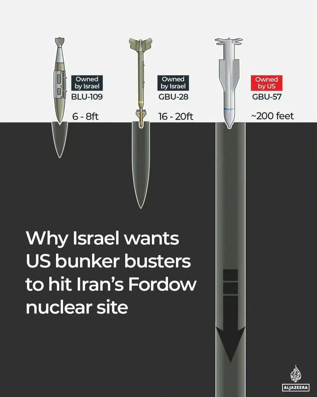 伊朗地下核设施有多坚固? 据说,伊朗的福尔多核设施位于地下约100米处,且该地处在坚硬的花岗石岩层下。 即便是美国最厉害的GBU-57巨型钻地弹,也需要在同一点上连续打击7次以上才能穿透。 2枚钻地弹落在一个坑中都非常难,更别提7枚“鱼贯”向下钻。 放眼整个历史,也从来没有哪个国家实现过。