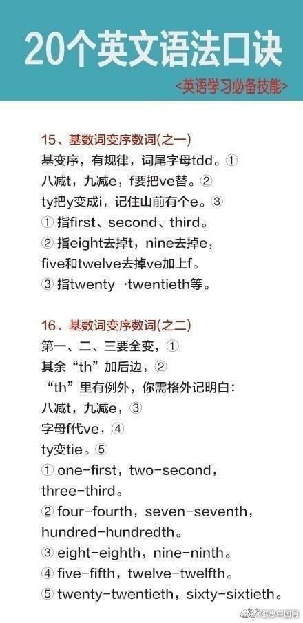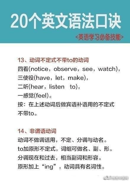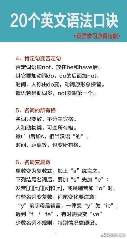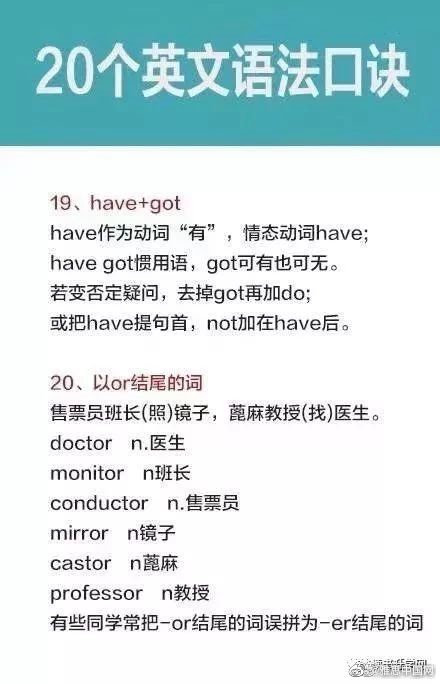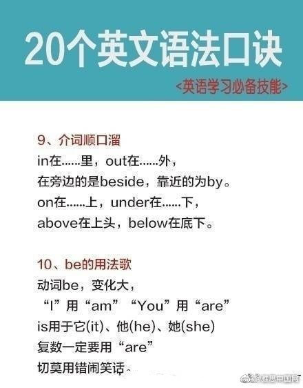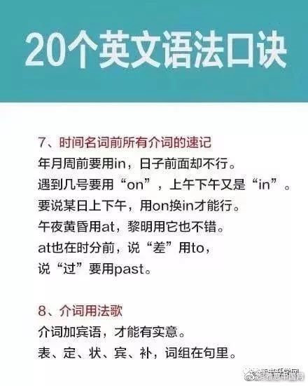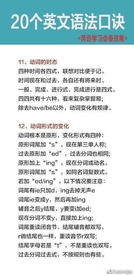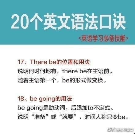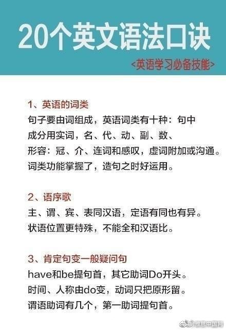 学习英语过程中,你觉得你哪一方面学的比较好,发音,单词,语法还是其他的呢?今天为大家分享的是语法知识,20个英文语法口诀,希望能帮助到大家。